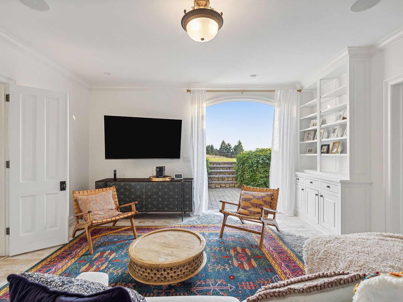 Bright and inviting, this family lounge offers a seamless blend of comfort and style. Large, white built-in shelves showcase family mementos and photo frames, inspiring a personal touch. The space features a modern flat-screen TV mounted above a geometric patterned console. Woven chairs and a rustic, low wooden coffee table rest atop a vibrant, patterned rug, adding warmth and color. Light walls and ceilings keep the space airy while natural sunlight floods in through an expansive arched glass door, which opens to a lush backyard. Cozy textures and thoughtful layout make this room perfect for family relaxation and casual gatherings.