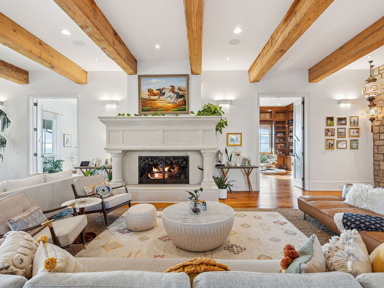 A spacious living room invites comfort with its light color palette, natural wood ceiling beams, and generous seating arrangement that can comfortably accommodate a family or guests. The grand stone fireplace serves as a captivating focal point, topped with a western-themed painting that adds warmth and character. Plush sofas and accent chairs are arranged around a central, textured coffee table and soft, patterned rug. Thoughtful touches like playful throw pillows, houseplants, and curated wall art create a welcoming, lived-in feel. Flanking doorways open to additional rooms, enhancing the open, airy layout perfect for family gatherings and relaxed entertaining.