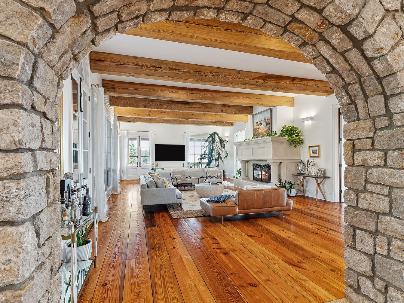 A welcoming open-concept living room viewed through a rustic stone archway, blending both elegance and warmth. Exposed wooden beams add architectural interest to the ceiling, while the golden-toned, wide-plank hardwood flooring provides a durable and family-friendly foundation. A plush sectional sofa and a leather accent couch invite relaxation and conversation, centered around a classic fireplace with a beautiful mantel. Light streams in through large windows, illuminating the soft neutral palette and greenery that breathe freshness into the space. Thoughtful arrangements like a cozy bar cart and framed photos foster a lived-in, inviting atmosphere ideal for gatherings and family moments.