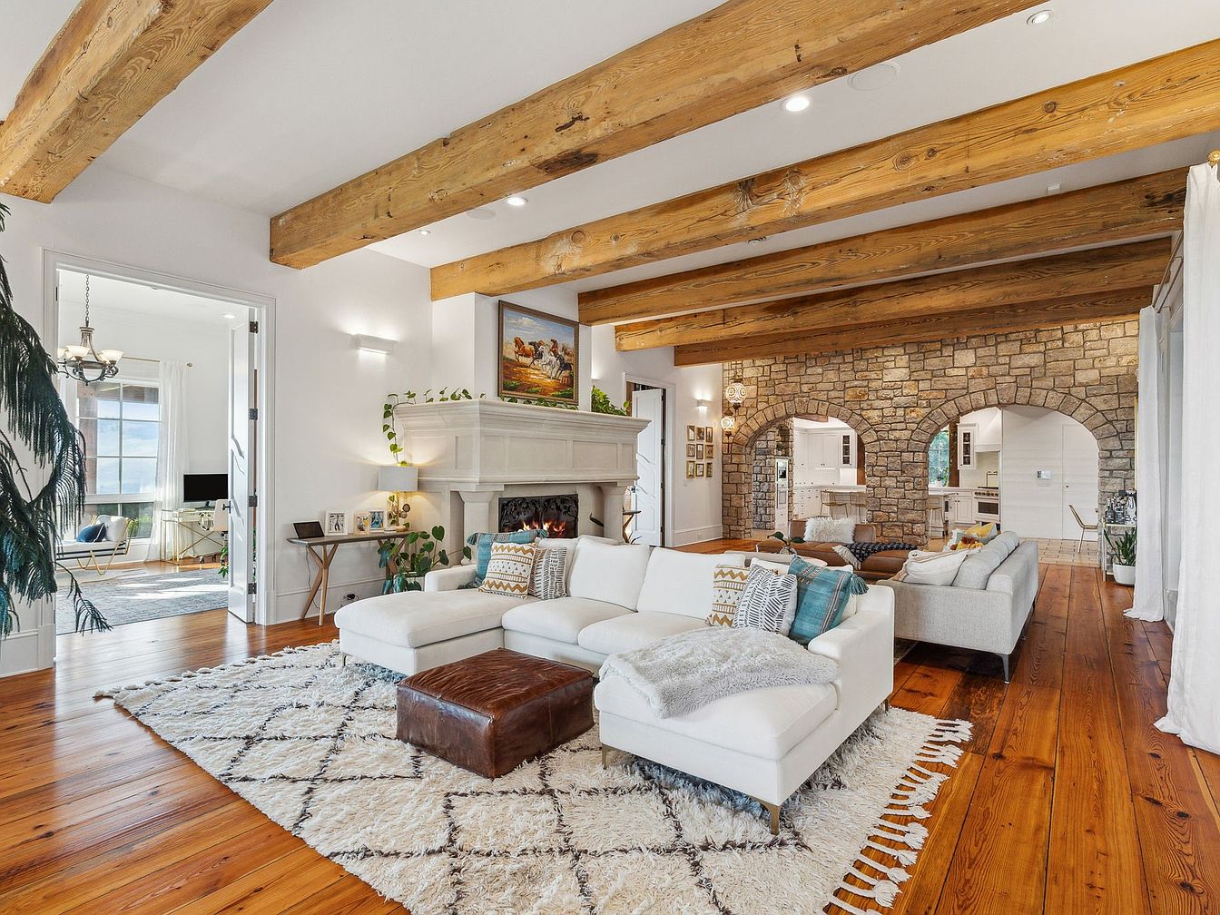 A spacious living room combines rustic charm with modern comfort, featuring exposed wooden beams against crisp white walls and a richly textured stone accent wall with arched openings leading to the kitchen. The open layout ensures plenty of room for gatherings, with plush white sectional sofas arranged around a cozy fireplace. A geometric, tasseled rug anchors the seating area, while warm natural wood floors add a welcoming feel. Soft neutral colors, layered textiles, and family-friendly zones make it easy to relax or entertain. Thoughtful decor, including indoor plants and art, lends the space personality and warmth, perfect for family living.