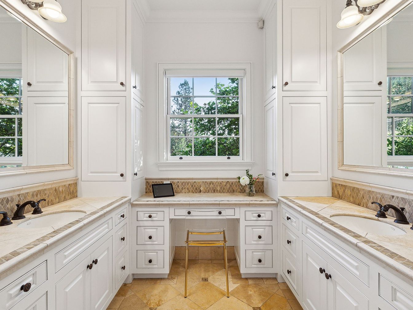 This elegant bathroom vanity area welcomes you with twin sinks positioned on opposite sides, flanked by tall white cabinetry that offers abundant storage for family toiletries and essentials. A generously sized window in the center lets in natural light, brightening the room and providing tranquil garden views. The neutral palette features cream and beige stone countertops and backsplash, complemented by warm tile flooring. Traditional bronze fixtures and classic framed mirrors enhance the upscale charm. A built-in makeup station with a stylish gold-accented chair encourages family convenience and daily routines, making it a practical yet serene retreat for busy households.