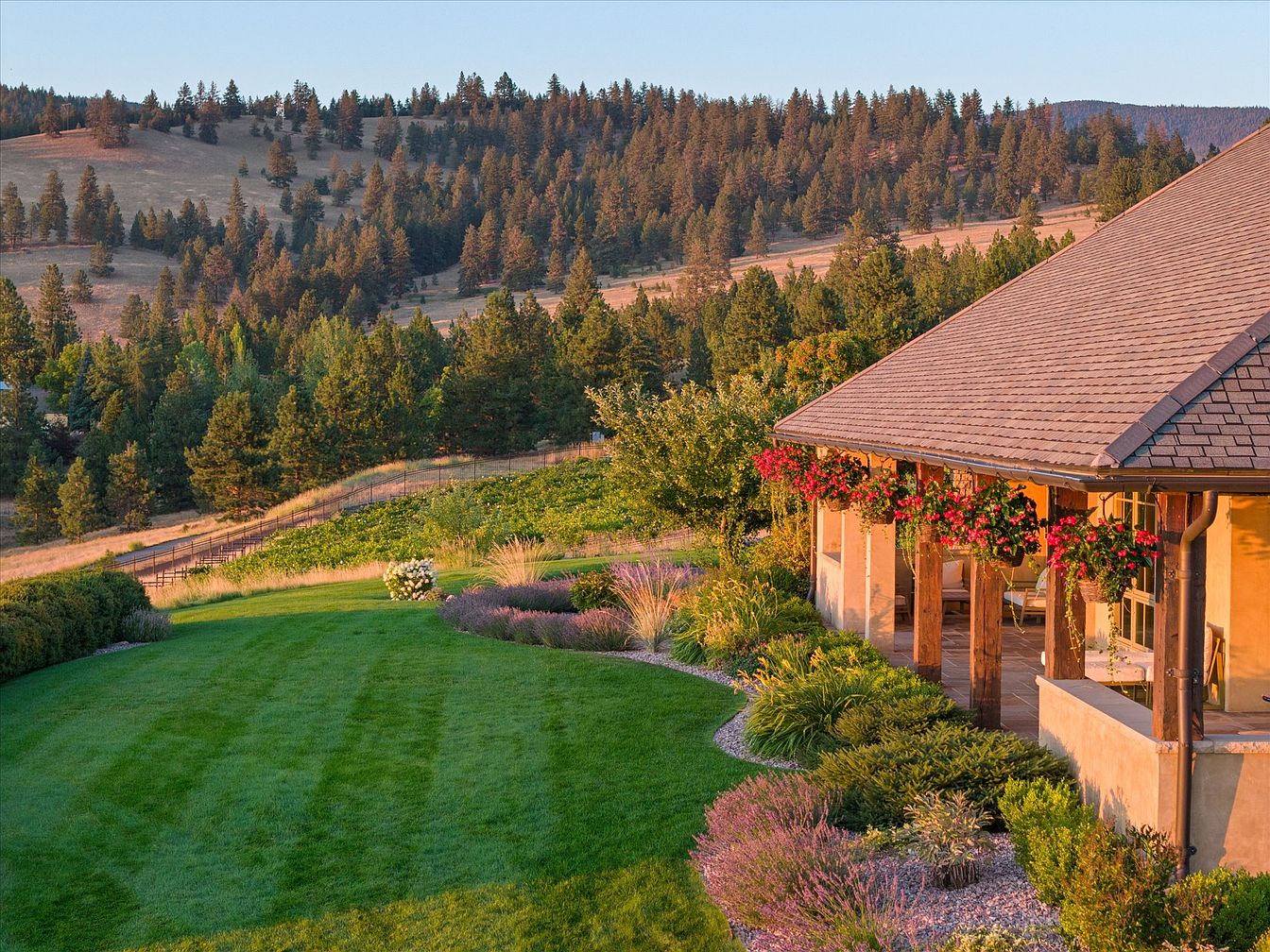 Spacious backyard with a lush, manicured lawn gently curving away from a charming covered patio, perfect for gatherings and family fun. Mature landscaping features a variety of shrubs, flowering plants, and ornamental grasses, creating a natural yet meticulously designed space. The covered patio, supported by rustic wooden pillars, offers a shaded area ideal for outdoor seating and relaxation. Hanging baskets bursting with vivid blooms decorate the patio’s border, adding vibrant color. The panoramic view of rolling hills and pine forests provides a serene, scenic backdrop, making this backyard a tranquil retreat for adults and a safe play area for children.