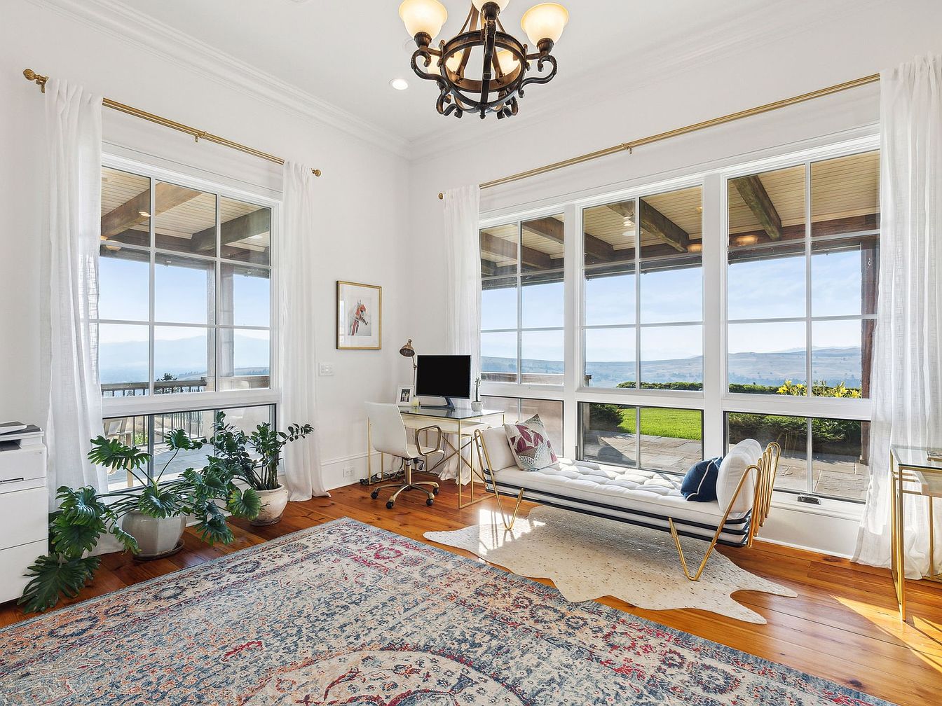Bright and inviting, this home office features expansive windows allowing natural light to flood the space and offer stunning views of the surrounding landscape. Crisp white walls and sheer drapes enhance the airy atmosphere, while warm hardwood floors add an element of coziness. The gold-accented furniture, including a modern desk, comfortable chair, and an elegant tufted settee, combine style with function. Lush potted plants by the windows add a family-friendly, calming touch, making the area perfect for both productivity and relaxation. An oversized, patterned rug grounds the room and provides a soft play area for children or pets.