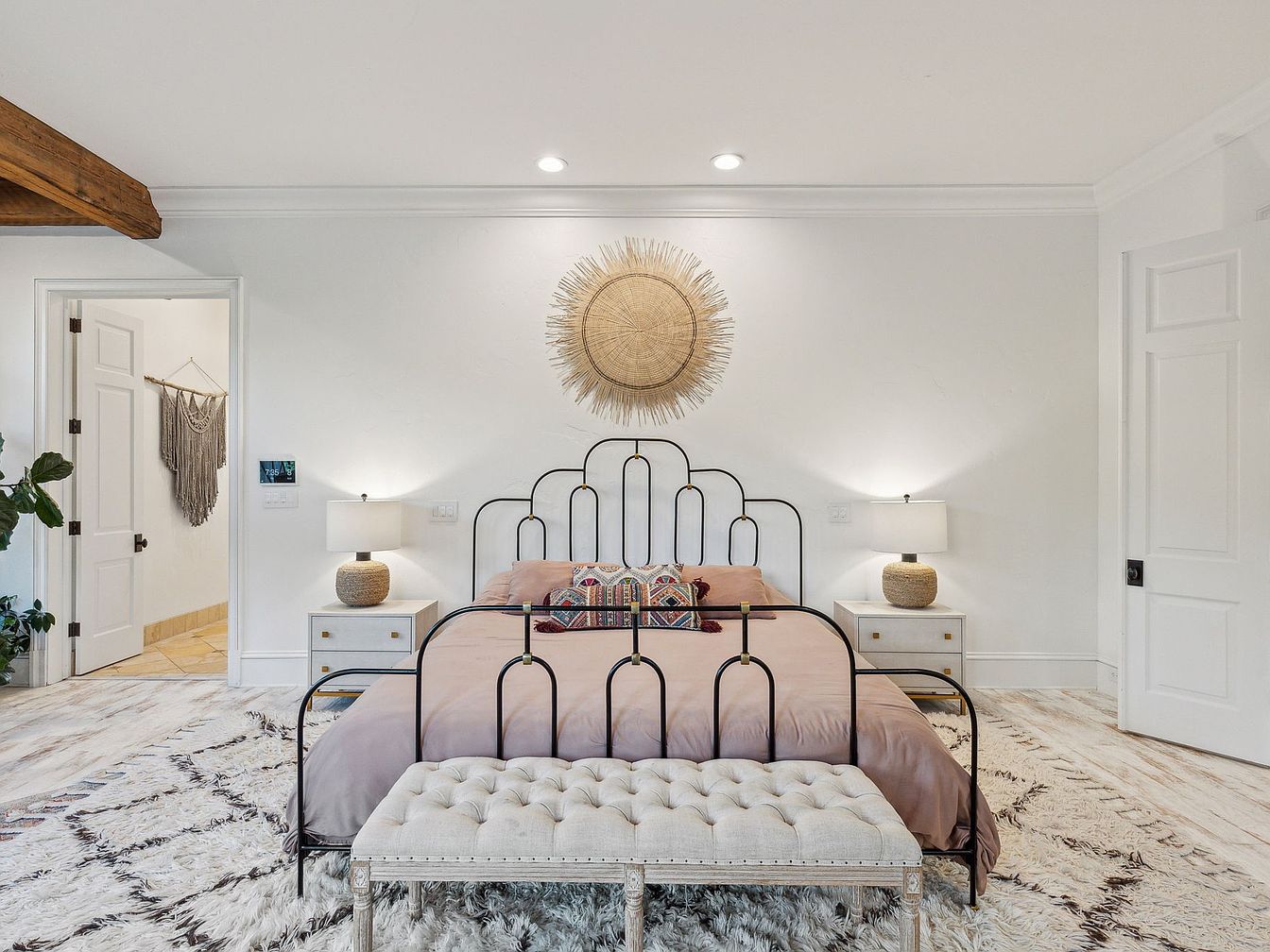 A spacious, serene master bedroom showcases a blend of modern and bohemian aesthetics. The centerpiece is a striking black metal bed frame topped with soft, blush bedding and a trio of colorful geometric accent pillows, ideal for adding warmth and personality. Flanking the bed, matching nightstands with textured table lamps create symmetry and provide convenient lighting for family reading time or nighttime routines. The plush, patterned area rug and tufted bench at the foot of the bed add comfort and inviting texture, while the neutral walls and large sunburst wall art foster a light, airy atmosphere perfect for relaxation and family connection.