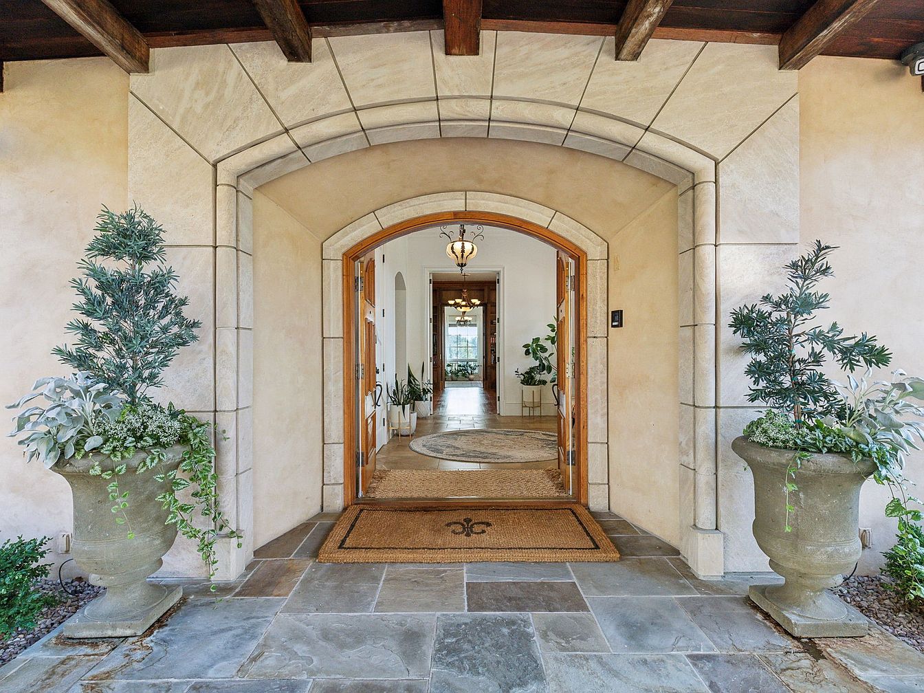Stepping through this spacious entryway, guests are greeted by an inviting arched stone doorway framed with elegant masonry. Two large planters with lush greenery bracket the entrance, adding a welcoming touch and a pop of natural color. The pathway is lined with classic stone tiles, leading into a bright, airy foyer with warm neutral walls. Overhead, exposed dark wooden beams accentuate the rustic yet sophisticated feel. The interior features a large round rug, elegant light fixtures, and potted plants, creating a family-friendly space that balances luxury with a sense of comfort and openness perfect for gatherings.