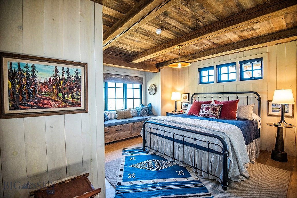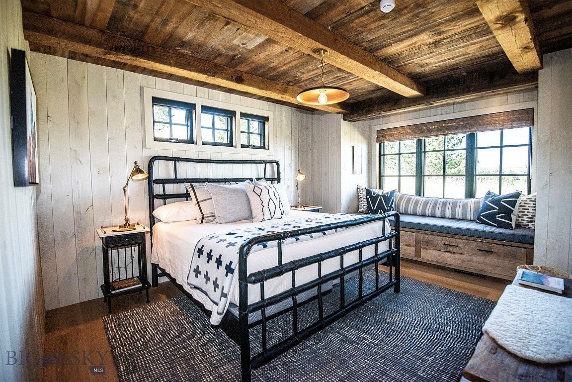 This inviting bedroom features a charming blend of rustic elegance and modern comfort. The dark metal bed frame contrasts beautifully with the light wood-paneled walls, creating a cozy atmosphere. A soft, geometric-patterned blanket adds a touch of warmth. Natural light floods through multiple windows, complemented by sleek black frames, enhancing the airy feel. A built-in bench provides a cozy reading nook, accented with plush throw pillows, ideal for relaxation. The warm wood ceiling beams and tasteful lighting fixtures contribute to a serene ambiance, making this space perfect for unwinding at the end of the day.