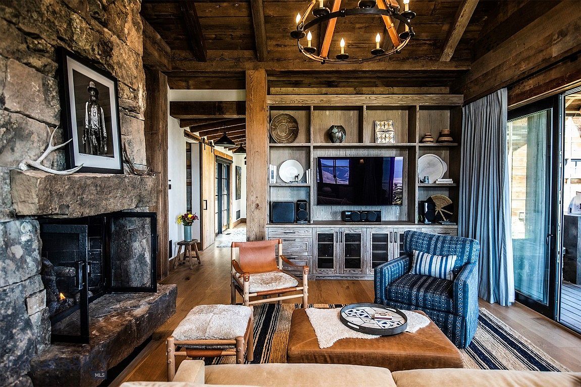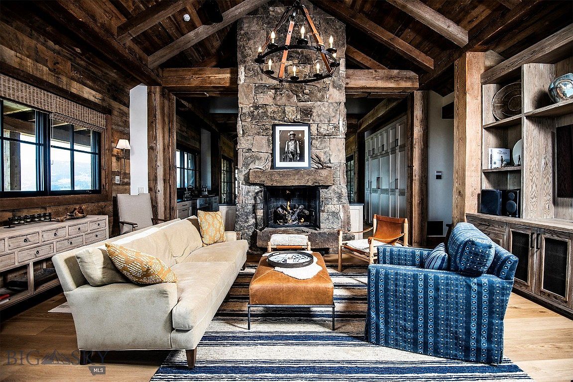 Warmth radiates from this inviting living room, featuring rustic wooden beams and a sophisticated stone fireplace that anchors the space. The open layout emphasizes family-friendly comfort, with plush seating that encourages relaxation. A mix of textures is on display, from the woven rugs to the soft upholstery of the furniture. The color palette blends earthy tones with vibrant blues and whites, creating a welcoming atmosphere. Thoughtful details like built-in shelves showcase art and decorative pieces, while large windows invite natural light and offer a seamless connection to the outdoors, enhancing the room’s airy feel.