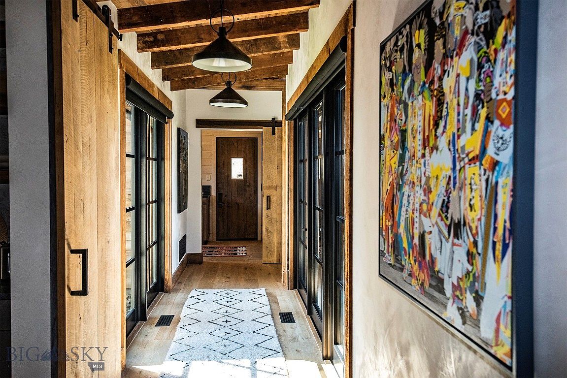This charming hallway features rustic wooden beams overhead that harmonize with the warm wood accents on the door frames and sliding barn doors. Light filters in through black-framed windows, creating a bright and airy atmosphere. A stylish, geometric area rug adds texture and warmth to the hardwood floor, enhancing the cozy vibe. An eye-catching piece of artwork brightens one wall, inviting conversation and personal expression. The thoughtful design elements showcase a seamless blend of contemporary and traditional aesthetics, making it an inviting transition space for family and guests alike, while the ample natural light fosters a welcoming environment.