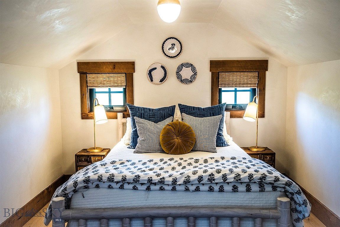 This cozy bedroom features a charming sloped ceiling, enhancing its intimate ambiance. The design showcases a blend of rustic and modern aesthetics, with wooden beams framed by soft white walls. A plush bed adorned with patterned linens offers a welcoming touch, while decorative pillows in varying textures add depth. Flanking the bed, stylish lamps provide warm lighting, ideal for reading. The windows, dressed with natural blinds, invite gentle light, complementing the room’s serene atmosphere. Antique bedside tables offer storage without compromising space, making this a perfect family-friendly retreat for relaxation and comfort.