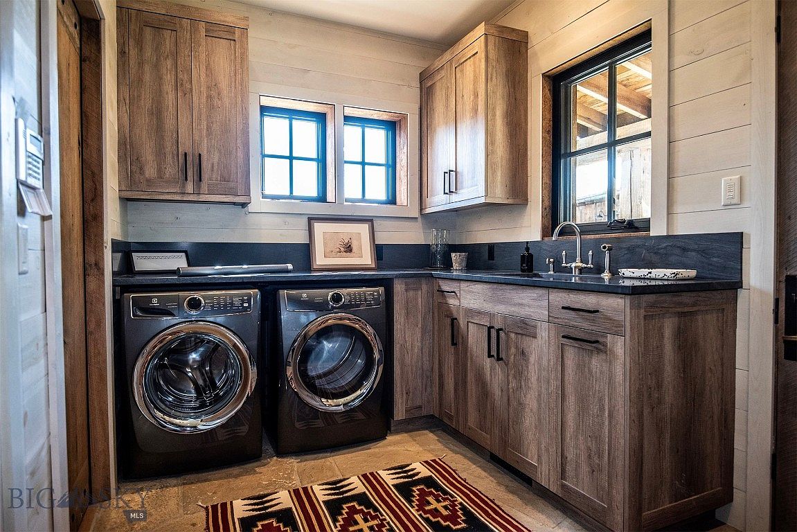 This inviting laundry room seamlessly combines functionality with aesthetic appeal, featuring modern stainless steel appliances that complement the rustic elegance of the wooden cabinetry. Natural light floods in through the double windows, enhancing the bright color scheme of white walls accented by dark granite counters. A stylish area rug adds warmth and texture, perfect for a busy family environment. Ample storage in the upper cabinets and various organizational elements ensures this space remains clutter-free. The thoughtful layout promotes ease of use, making laundry chores feel less like a task and more like a part of home life.