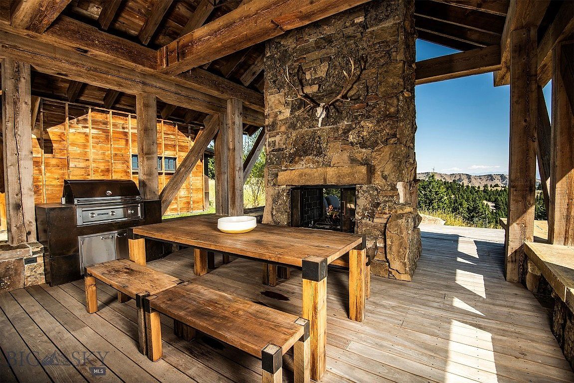 Embrace outdoor living in this stunning space combining rustic charm with modern convenience. The solid wood dining table, complemented by matching benches, invites family gatherings under a vaulted wooden ceiling. A cozy stone fireplace, adorned with antlers, creates an inviting focal point, perfect for evening relaxation. Nearby, a stainless-steel grill stands ready for summer barbecues, enhancing the entertainment potential. Natural light streams through expansive openings, melding the indoors with the surrounding landscape. The warm color palette of natural wood and stone accentuates the serene outdoor environment, offering a perfect retreat for enjoying nature with loved ones.