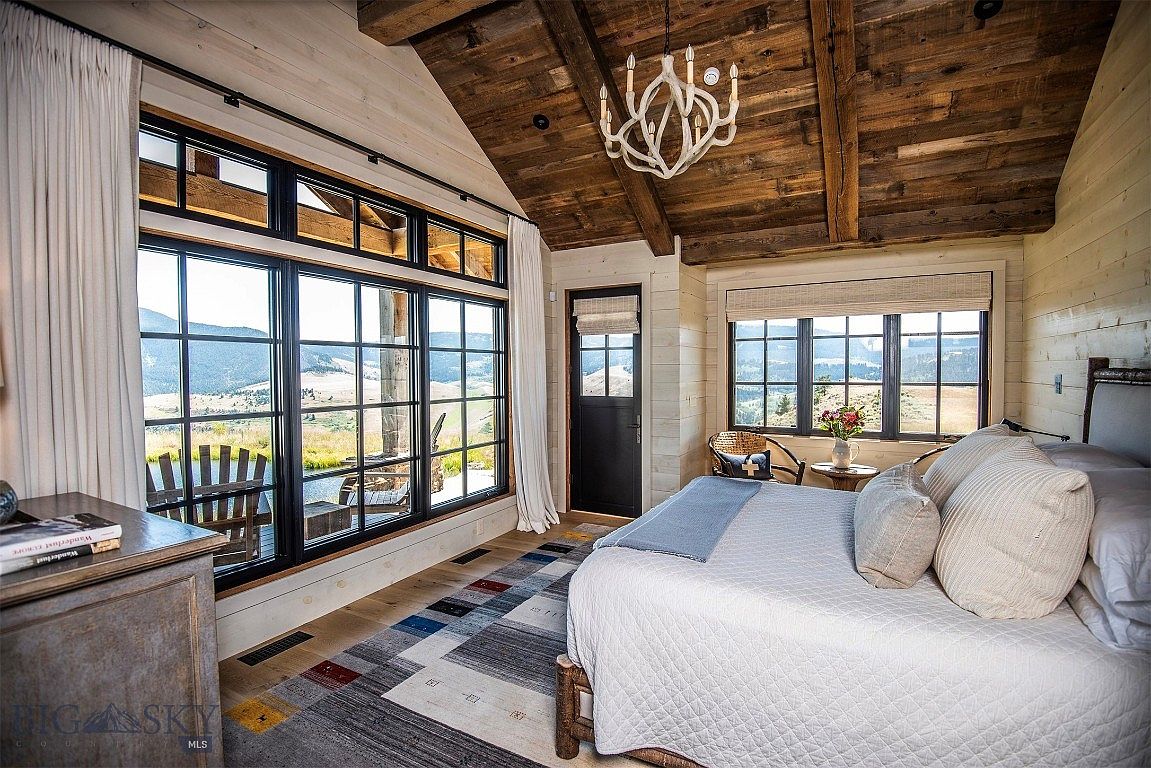 This master bedroom exudes warmth and tranquility, featuring vaulted ceilings adorned with rustic wood beams that complement the paneled walls. Large windows frame breathtaking views of the surrounding landscape, inviting natural light into the space, while offering a seamless connection to the outdoors. The color palette embraces soft neutrals and calming blues, creating a serene ambiance. A cozy bed, layered with plush bedding and decorative pillows, centers the room. The stylish area rug adds a touch of comfort underfoot, while the chic chandelier serves as a focal point, enhancing the inviting atmosphere for relaxation and rejuvenation.