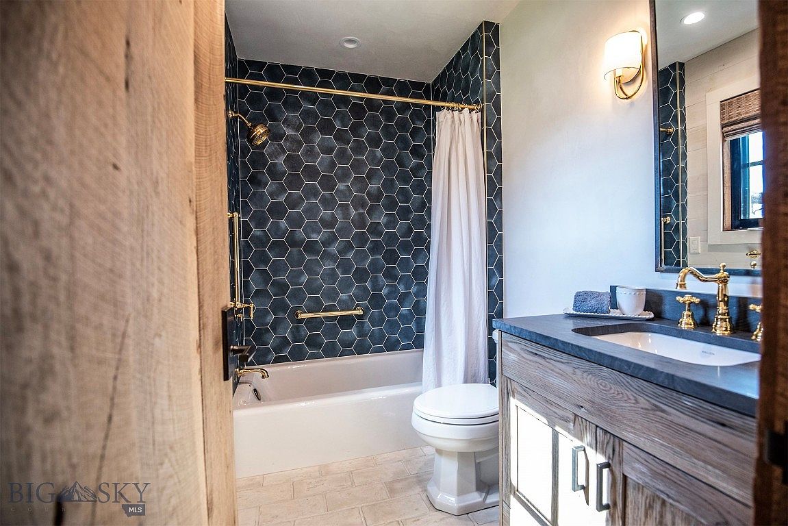 This modern bathroom features a striking design that combines functionality with elegance. The hexagonal blue tile accent wall creates a dramatic backdrop, while the soft white shower curtain adds a touch of warmth. The vanity showcases a sleek dark countertop and rustic wooden cabinetry, providing ample storage and a contemporary aesthetic. Brass fixtures enhance the space, contributing a luxurious feel. The layout promotes family-friendly accessibility, with a comfortable tub for relaxation and a standard toilet nearby. Natural light from the window brightens the area, making it an inviting retreat for daily use while maintaining style and comfort.