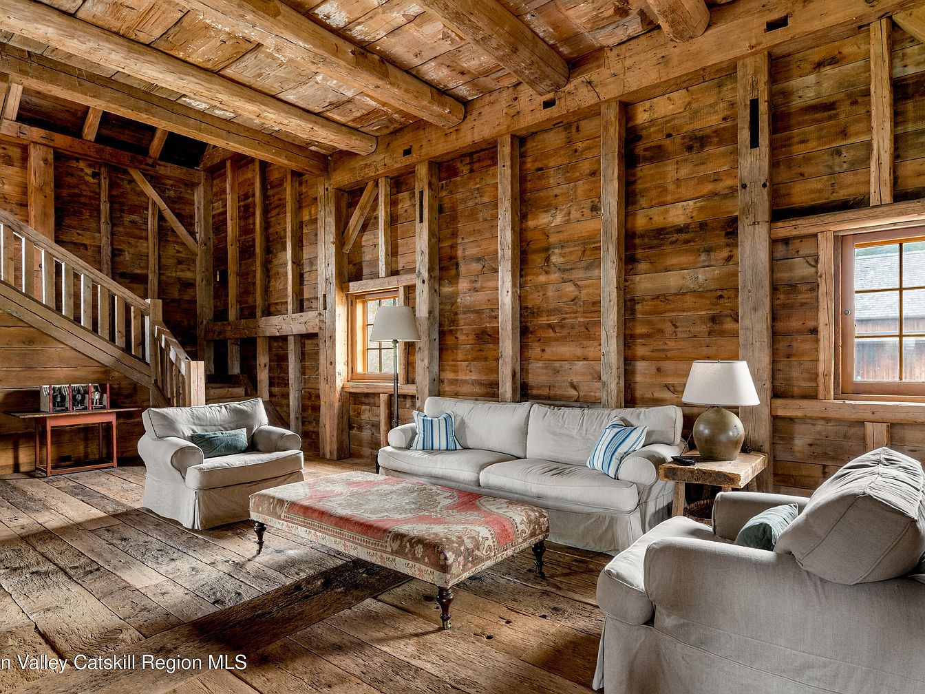 Warmth and comfort define this living room, enhanced by exposed wooden beams, natural wood-paneled walls, and wide plank flooring. The spacious, open layout invites togetherness, making it perfect for families. Large sofas and armchairs, upholstered in soft, neutral fabrics, are arranged in a cozy grouping ideal for casual conversation or movie nights. An antique-style ottoman doubles as a coffee table, adding vintage charm. Soft lighting from table and floor lamps creates a welcoming atmosphere. Large windows bring in natural light, highlighting the rustic textures and craftsmanship throughout, while the staircase adds architectural interest and a seamless transition to the upper level.
