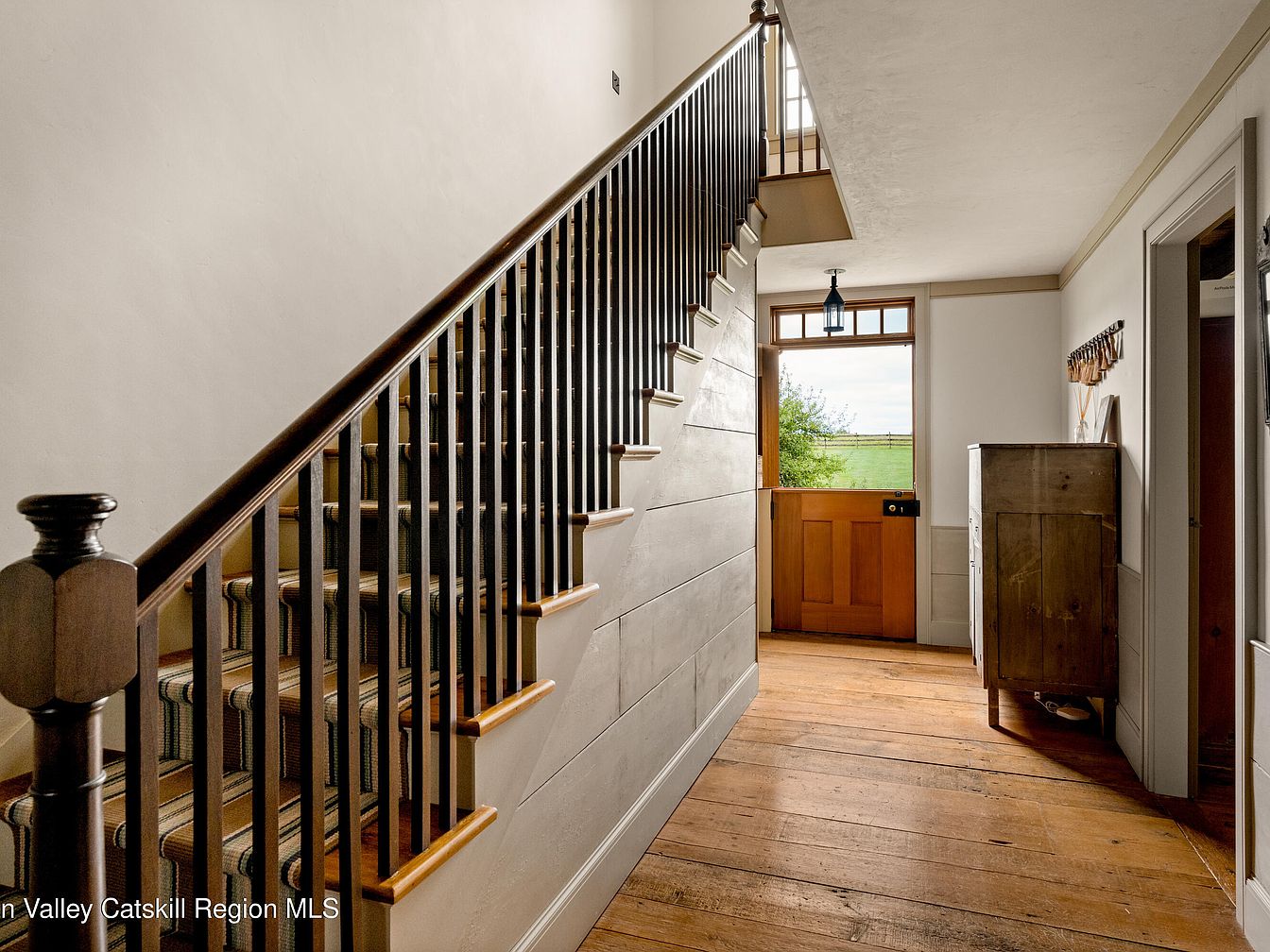 This inviting stairway entryway preserves classic American farmhouse charm with warm, honey-toned wood floors and a striking Dutch door that welcomes natural light into the space. The staircase is adorned with a striped runner, perfect for safe, family-friendly use, and features elegant, dark wooden railings that contrast beautifully with the soft neutral walls. A rustic wooden cabinet adds character and practical storage for everyday essentials. The layout is open and airy, allowing for easy movement and drop-off of coats and shoes, making it an ideal entrance for families who appreciate both style and functionality in their home.