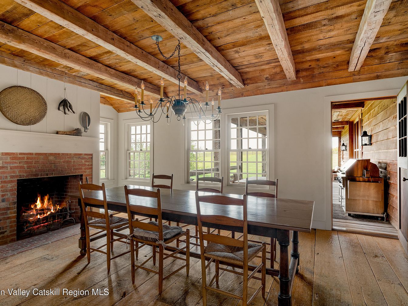 A welcoming dining room features rustic wooden beams across the ceiling and wide plank hardwood floors, creating a warm and inviting atmosphere ideal for family meals or gatherings. The space is anchored by a large brick fireplace, adding comfort and charm, while natural light streams in from multiple windows that frame lush outdoor views. Classic wooden chairs surround a long, sturdy table perfect for both everyday family use and entertaining guests. Neutral-toned walls with subtle decor pieces maintain a serene vibe, and a simple wrought iron chandelier completes the cozy, farmhouse-inspired setting, making it an ideal spot for creating lasting memories.