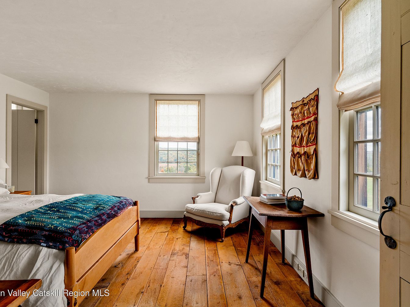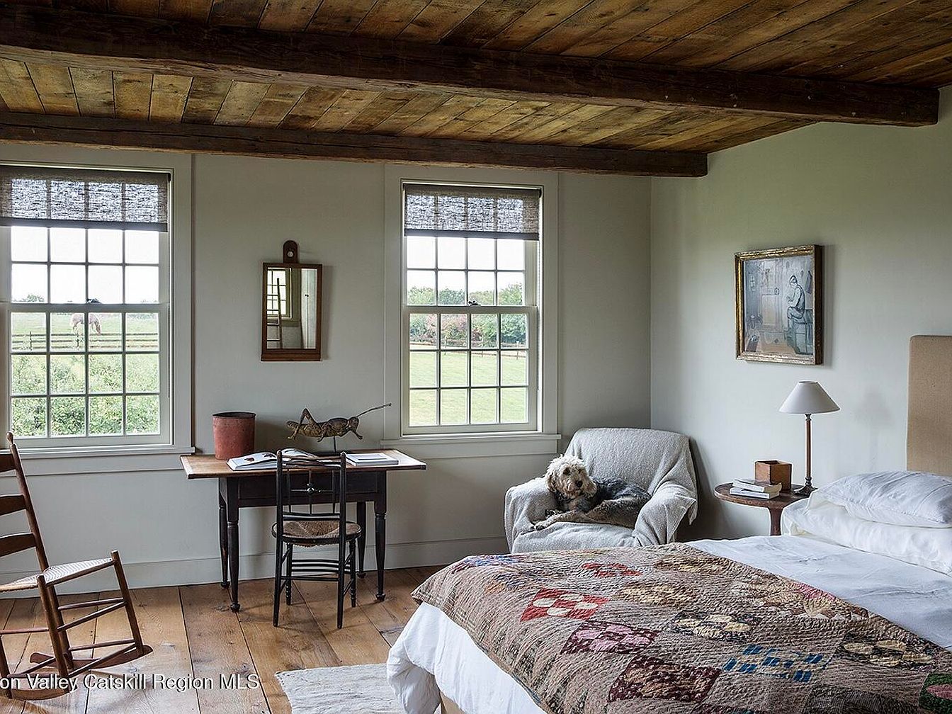 Warm and inviting, this bedroom corner boasts rustic charm through exposed wooden beams and wide-plank hardwood floors. Natural light streams through large grid windows that frame serene pastoral views, creating a peaceful retreat. The layout is thoughtfully arranged with a quaint writing desk nestled between the windows, perfect for studying or creative pursuits, and a comfortable armchair, ideal for relaxing with a pet. Soft neutral paint, a simple bed with a patterned quilt, and understated vintage furnishings make this room both stylish and functional for a family. Art and accessories add personality while preserving an open, airy atmosphere.