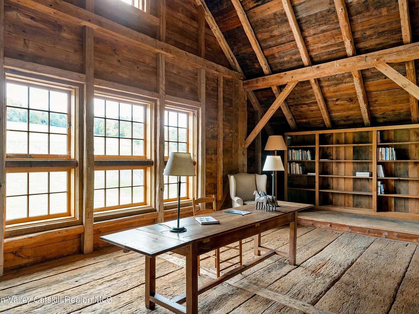 A bright and spacious home office library features rich wooden beams, wide plank floors, and expansive windows flooding the space with natural light. The rustic architecture creates a cozy, inviting atmosphere, while built-in shelves provide ample storage for books and decorative items. A large wooden desk offers plenty of workspace for work or study, complemented by comfortable seating in a classic armchair. Warm wood tones and simple, neutral furnishings highlight the homey, family-friendly charm, making this room ideal for both productivity and quiet relaxation. The open layout encourages togetherness and creativity, perfect for family use.