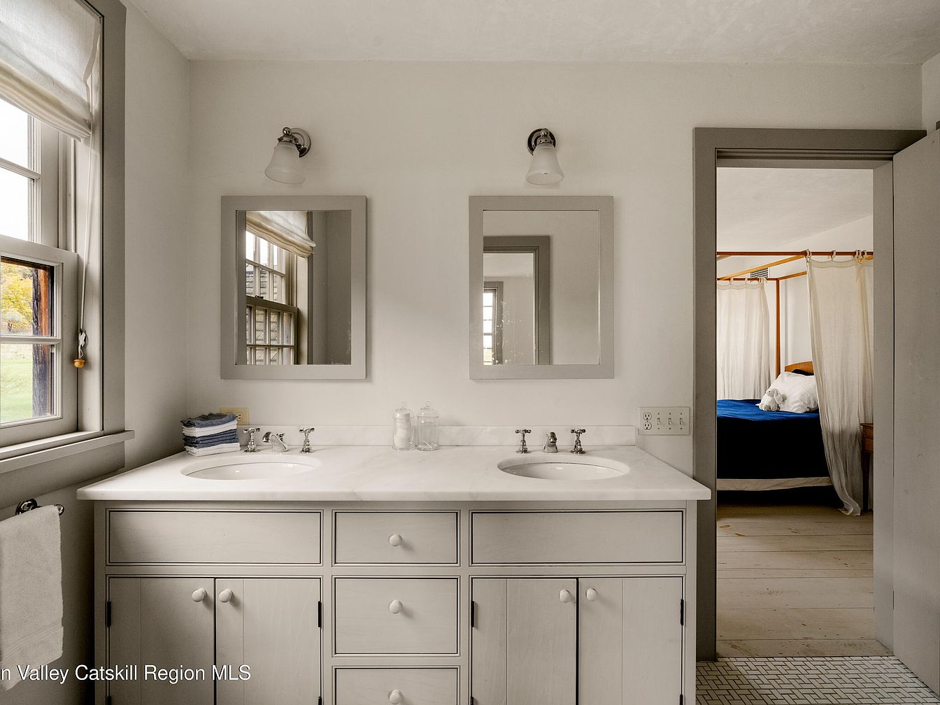 A bright and inviting double-sink vanity creates an ideal space for family use, featuring ample cabinetry for storage and a spacious marble countertop for added convenience. Soft, neutral tones dominate the room, giving it a serene and timeless appeal, while white framed mirrors and classic chrome fixtures enhance the understated elegance. Large windows let in abundant natural light, making the space feel open and airy. Each practical element, from the towel rack to the neatly folded linens, adds a cozy, lived-in touch. Direct access to an adjoining bedroom offers comfort and easy flow for everyday family routines.