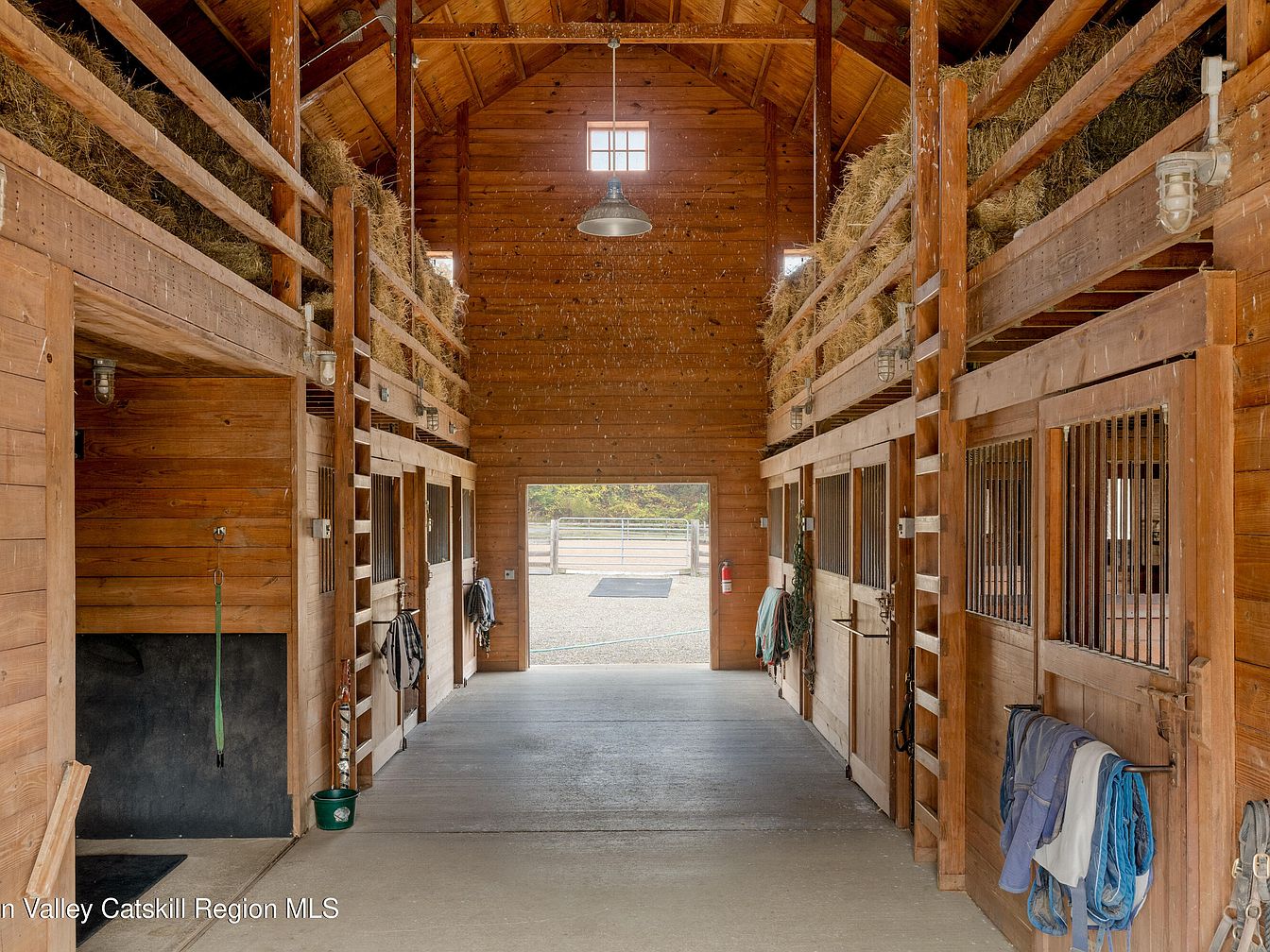 Spacious and thoughtfully designed, this barn interior showcases high vaulted ceilings, exposed beams, and warm wood paneling throughout for a welcoming rustic aesthetic. Dual rows of horse stalls line either side of the central aisle, offering ample storage space for riding tack and equipment, while upper lofts brim with hay, easily accessible via sturdy ladders. Ample natural light pours in through clerestory windows, creating a bright, inviting environment. Durable concrete flooring provides ease of maintenance and safety for both residents and animals, making this a family-friendly space ideal for equestrian activities and gatherings in a farm setting.