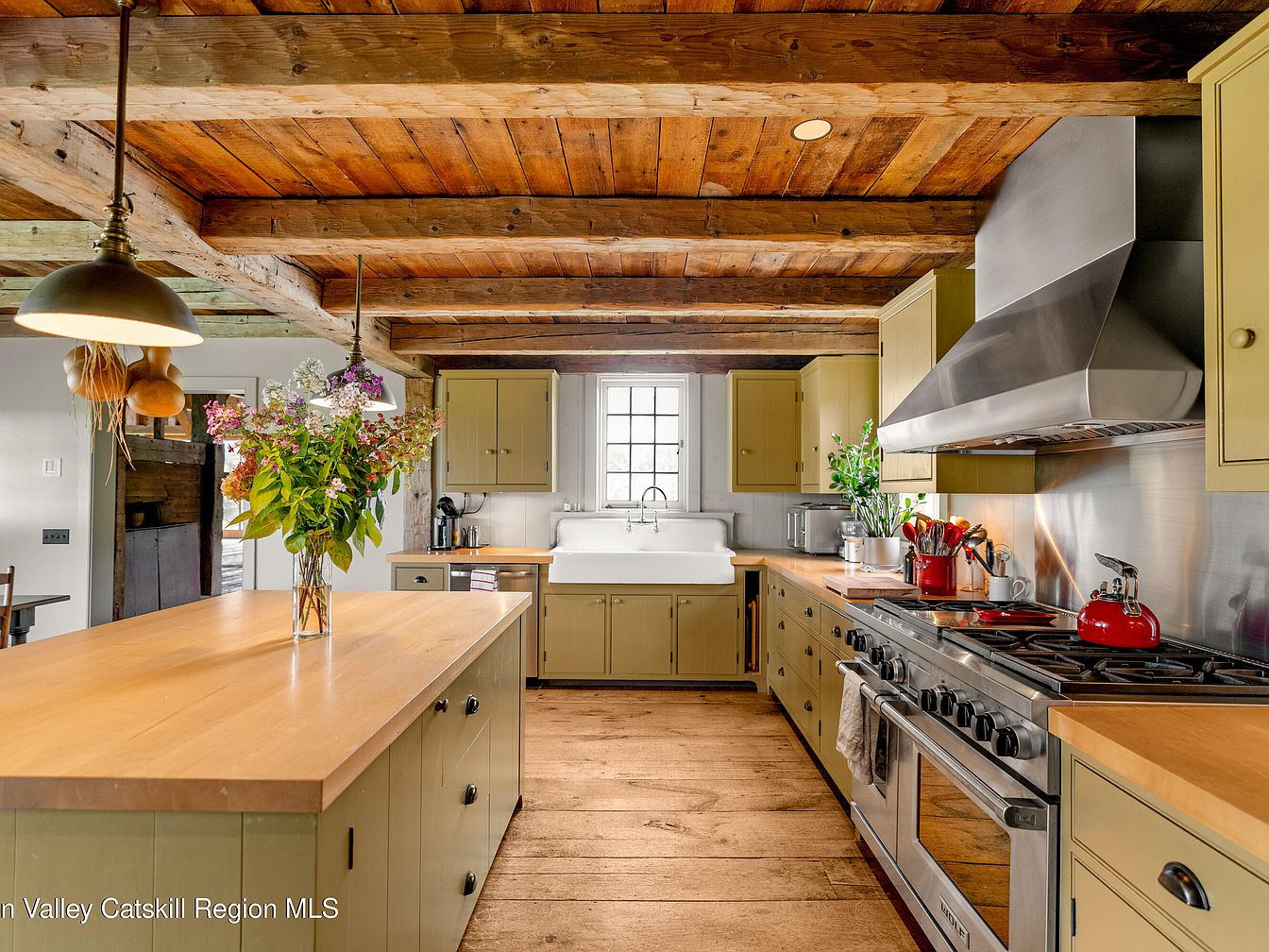 This warm, family-friendly kitchen showcases a rustic-meets-modern design with exposed wooden beams and a natural wood plank ceiling. The central island features a light wood countertop, providing ample space for meal prep or family gatherings, adorned with a vibrant bouquet of fresh flowers. Olive-green cabinetry offers both style and practical storage, complemented by butcher block counters. A large farmhouse sink sits beneath a classic window, while a stainless steel professional-grade stove and vent hood anchor the cooking area. Soft, earthy tones and thoughtful touches like pendant lighting and cheerful red accents make this kitchen welcoming for families.