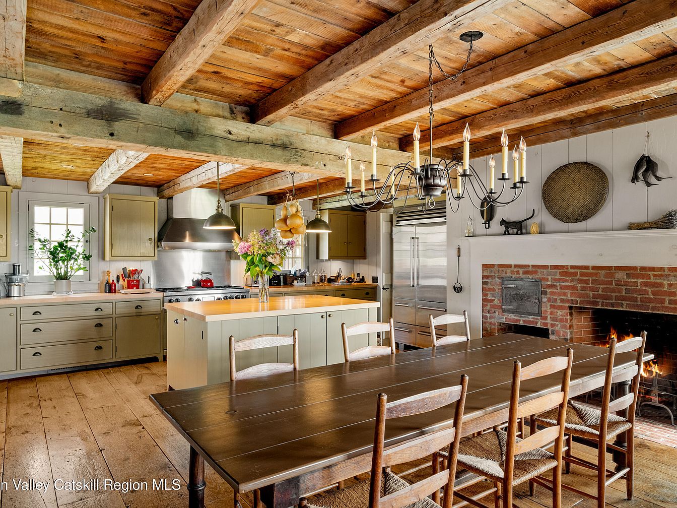 Open-plan kitchen and dining area with a warm, inviting appeal. Exposed wooden beams and natural wood ceilings give the space a farmhouse charm, while the large brick fireplace adds a cozy focal point perfect for family gatherings. The kitchen features sage-green cabinetry and a central island with butcher block countertops, accented by stainless steel appliances. A long wooden dining table with ladder-back chairs sits beneath an elegant wrought iron chandelier, providing plenty of seating for family meals or entertaining guests. Neutral hues, fresh flowers, and simple decorative touches create a welcoming, family-friendly environment ideal for daily living.