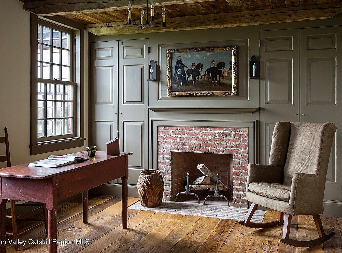 A cozy home office space blends historic charm with functional design. Distinguished by a red brick fireplace set in paneled, muted olive-green walls, the room features wide-plank wood floors and a rustic, exposed wood ceiling. Natural light floods the space through multi-paned windows, creating a warm, inviting atmosphere perfect for work or family time. A sturdy wooden writing desk and vintage rocking chair provide comfortable, family-friendly seating for reading or homework, while thoughtful decor, including a framed classical painting and wicker basket, adds a sense of heritage and refined simplicity. This timeless study is ideal for both productivity and relaxation.