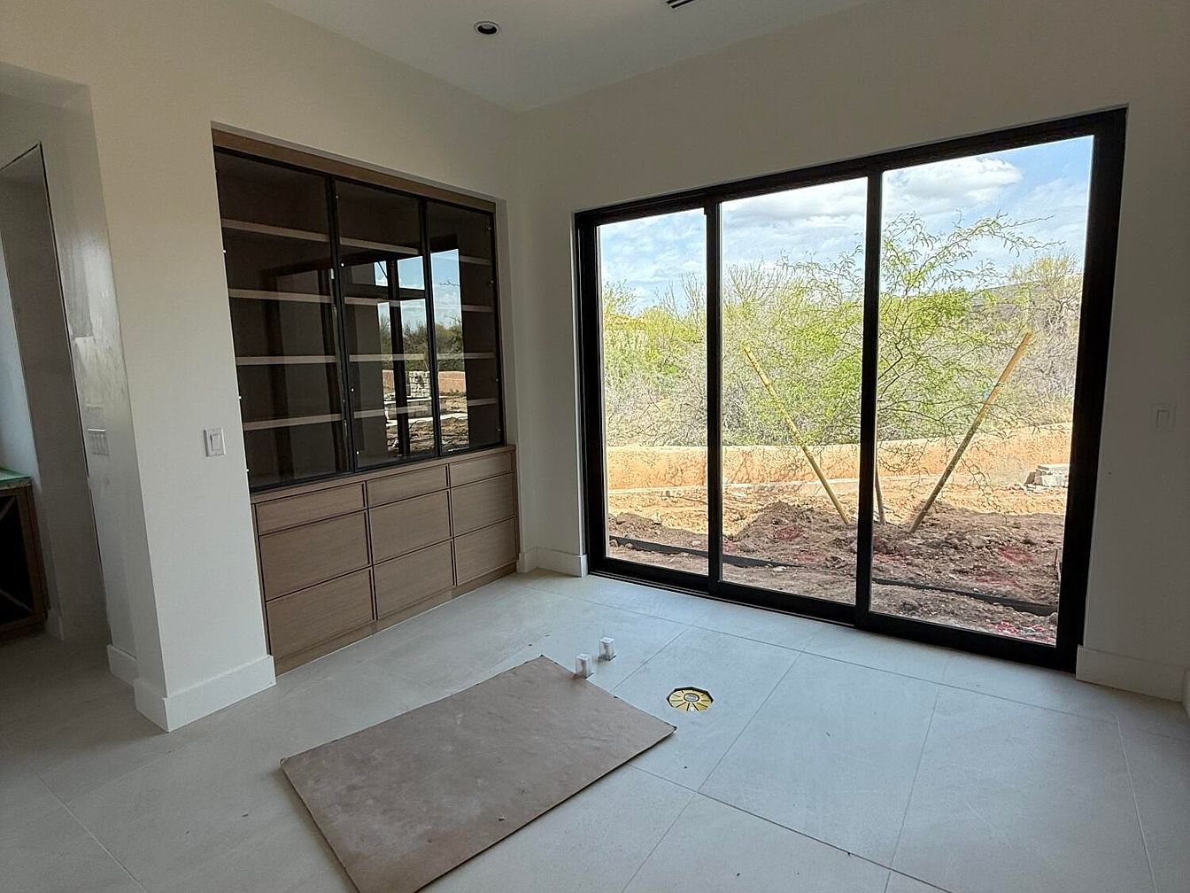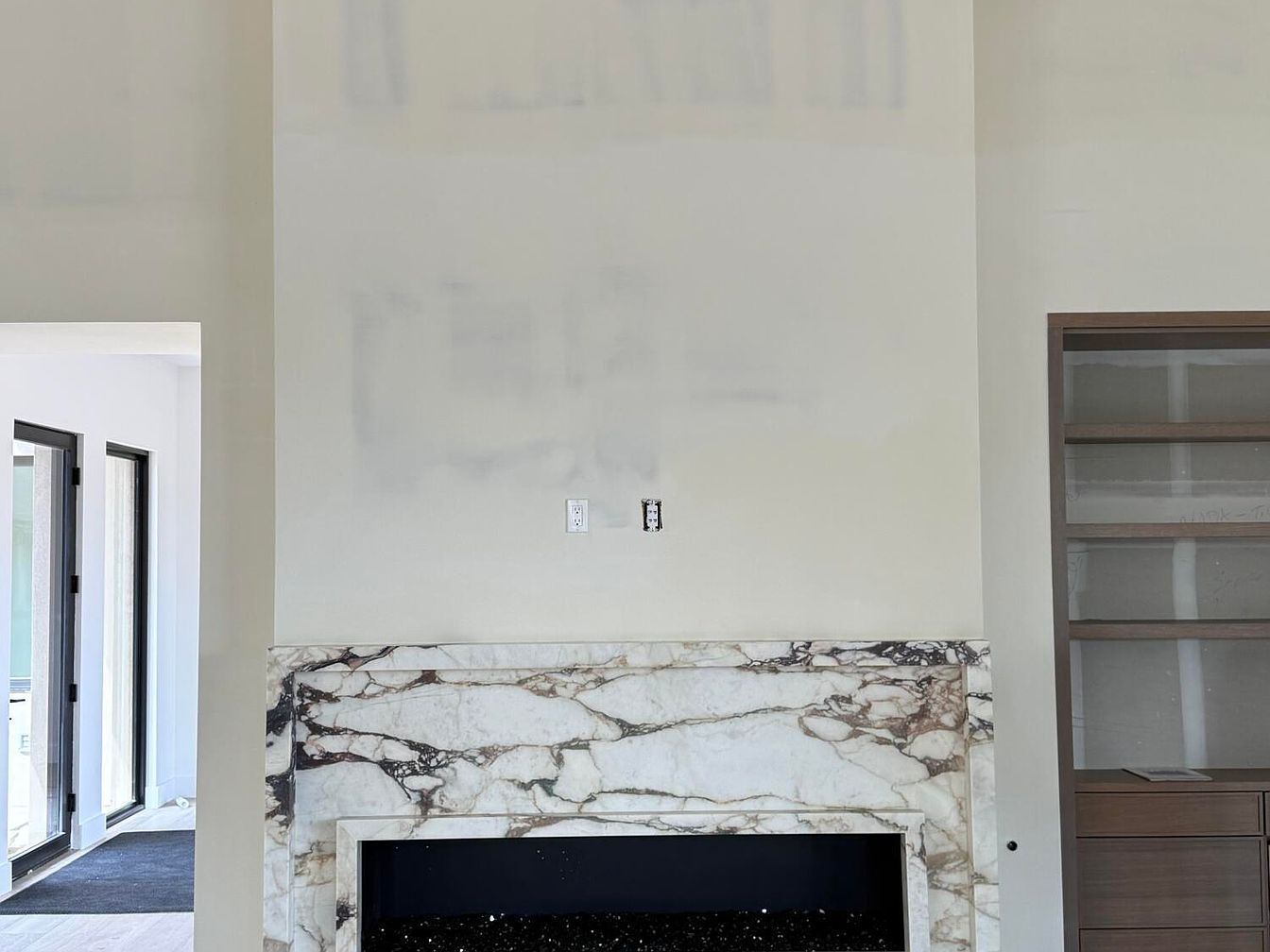 This inviting living room features an elegant, modern design centered around a stunning marble fireplace, showcasing rich veining that adds a touch of luxury. The expansive walls, primed for paint, create a bright and open atmosphere, perfect for family gatherings. Natural light floods through large windows, seamlessly connecting indoor and outdoor spaces. Sleek built-in shelving to the right offers practicality, providing display space for decorative items while maintaining clean lines. The neutral color palette embraces warmth and tranquility, making it a versatile backdrop for personal style. This room is designed for comfort and family-friendly living.