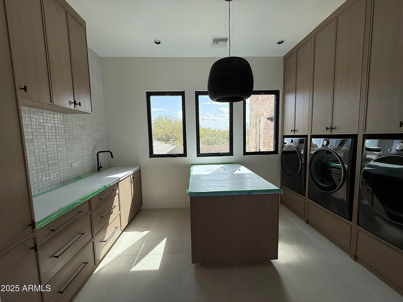 This laundry room combines functionality and modern design. Featuring spacious cabinetry in warm wood tones, the room emphasizes storage efficiency with both upper and lower cabinets that provide ample space for supplies. Sleek, black appliances harmonize with the light color palette, while a striking island countertop offers additional workspace. Natural light floods in through large windows, complemented by a minimalist pendant light, enhancing the inviting atmosphere. The contemporary tile backsplash adds sophistication, contrasting beautifully with the neutral walls. Family-friendly features include easy-to-clean surfaces and a practical layout that promotes organization and efficiency in daily household tasks.
