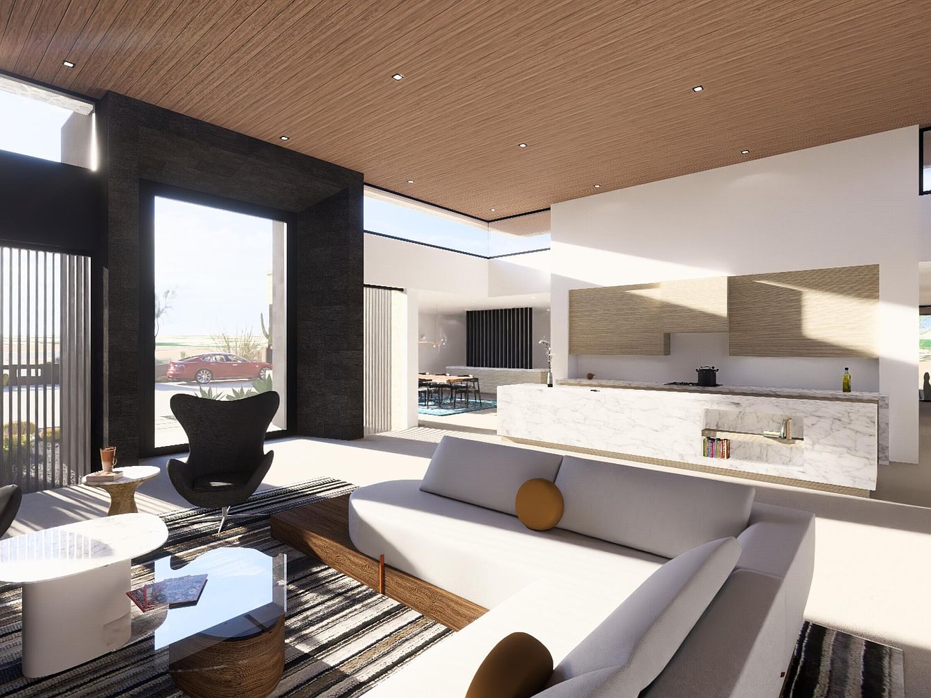 A seamless blend of comfort and elegance defines this stunning modern living area. Expansive windows usher in natural light, enhancing the open layout that connects seamlessly to the kitchen. The warm wood ceiling contrasts beautifully with the sleek marble kitchen island, creating an inviting ambiance. Generously sized furniture, including a chic black accent chair and a cozy sectional, offers ample seating for family gatherings. Earthy tones are accented with vibrant decor, while the area rug adds texture underfoot. This home effortlessly combines style and functionality, making it ideal for relaxed living and entertaining.