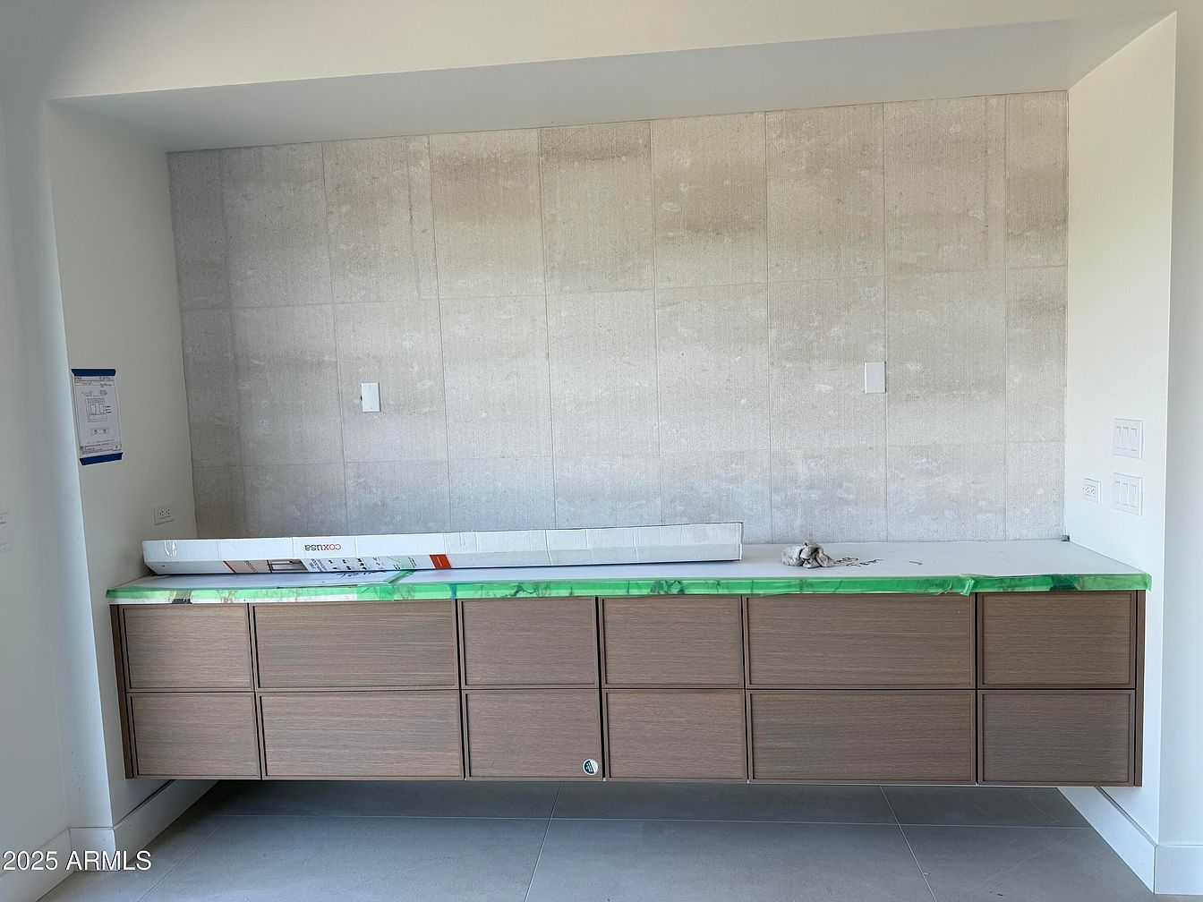 This modern kitchen layout showcases sleek, minimalist cabinetry in a warm wood finish that complements the cool, textured concrete wall. The uncluttered design emphasizes spaciousness, perfect for family gatherings or cooking with friends. A stylish countertop, currently wrapped for protection, features a vibrant green edge, adding a pop of color to the neutral palette. The open space layout enhances functionality, while strategically placed electrical outlets ensure convenience during meal prep. Ample storage solutions within the cabinetry allow for organized kitchen essentials, promoting a tidy and family-friendly environment, making it an ideal space for culinary creativity.