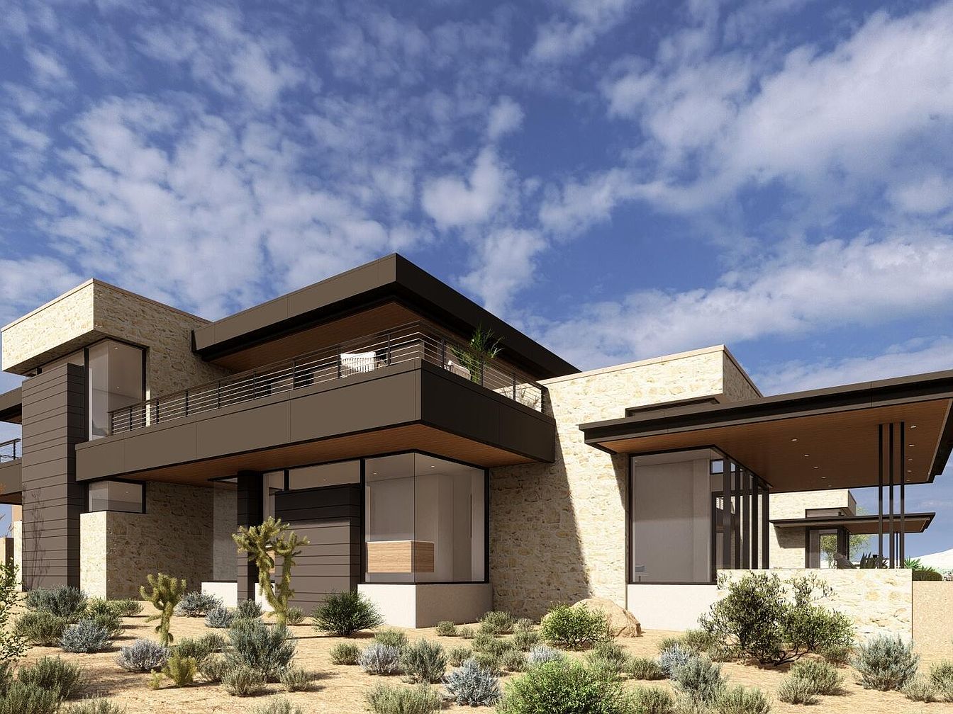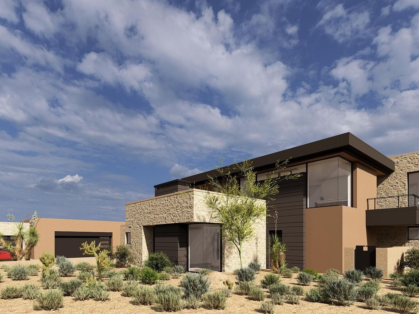 This modern desert home beautifully melds natural stone and sleek metal elements, showcasing a striking architectural design. The expansive layout features strategically placed balconies that invite natural light and breathtaking views. Its earthy color palette harmonizes with the surrounding landscape, while lush greenery complements the minimalist exterior. Family-friendly features include spacious open areas that encourage interaction and a layout designed for seamless indoor-outdoor living, perfect for gatherings. Architectural details, such as the cantilevered roof and large glass windows, exemplify contemporary elegance and functionality, ensuring this home is both stylish and welcoming, ideal for any family.