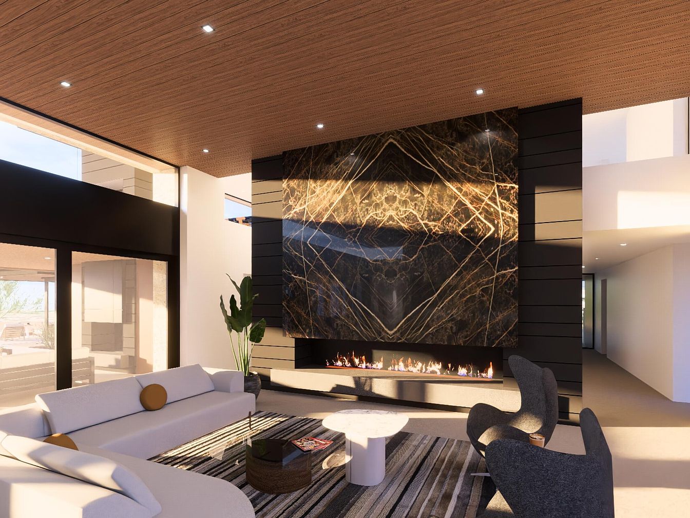 This modern living room features a stunning focal wall adorned with dark, luxurious stone, accentuated by a contemporary linear fireplace that adds warmth and elegance. The spacious layout is enhanced by abundant natural light pouring through large glass panels, seamlessly connecting indoor and outdoor spaces. Plush, neutral-colored sofas invite relaxation, complemented by stylish armchairs that contrast with the rich textures of the space. A round coffee table grounds the area, and a chic striped rug adds a touch of sophistication. The wooden ceiling introduces warmth, while sleek architectural lines and thoughtful greenery create a harmonious atmosphere.