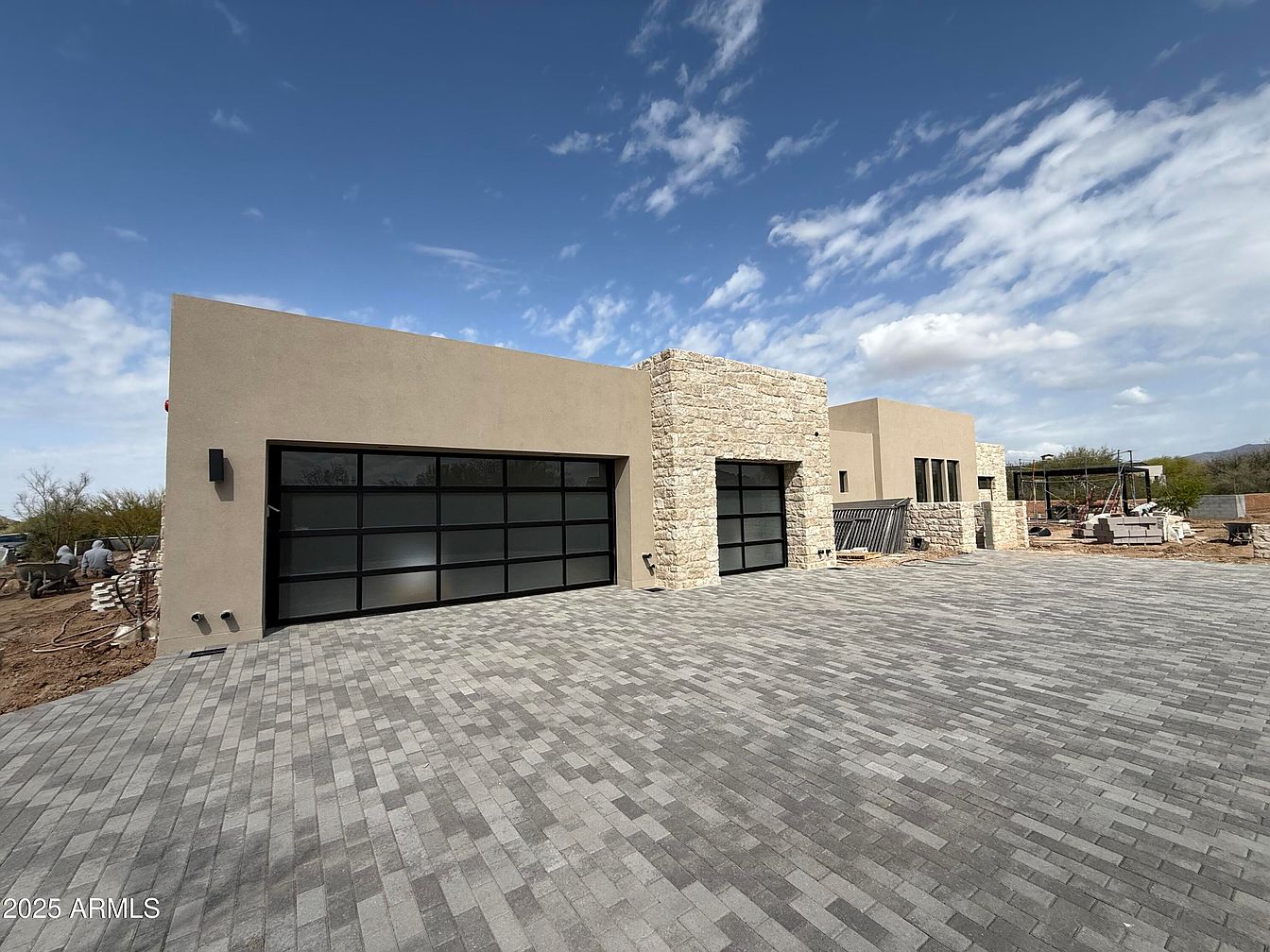 A striking modern exterior featuring a blend of smooth stucco and rugged stone, this residence showcases contemporary architectural elements. The flat roofline and expansive glass garage doors create a sleek, linear aesthetic, enhanced by the contrasting textures of the natural stone accents. A spacious, paved driveway leads to the entrance, offering ample parking. The light taupe walls are balanced with dark window frames, ensuring a harmonious look. Set against a backdrop of blue skies, the open space around the home invites outdoor living opportunities, making it an ideal family-friendly retreat, perfect for gatherings and leisure.