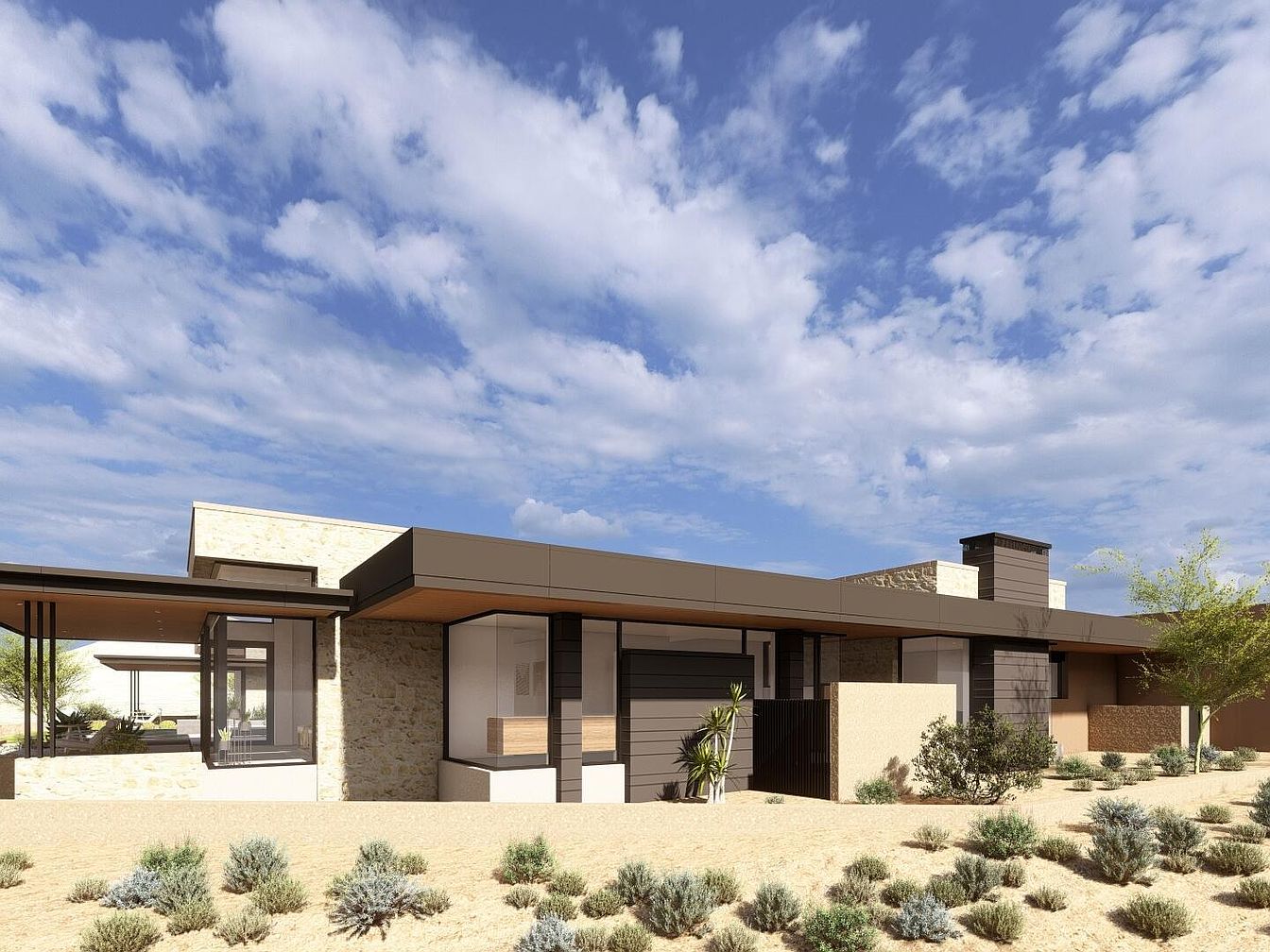 This striking modern desert home features a sleek façade with a blend of stone and metal finishes. The design incorporates bold geometric lines, highlighting the contemporary architectural style. Large windows allow for natural light, while the earthy color palette of browns and taupes harmonizes with the surrounding landscape. Family-friendly outdoor spaces are thoughtfully integrated, offering ample room for relaxation and social gatherings. Lush, low-maintenance landscaping complements the architecture, enhancing its appeal. The open design emphasizes connectivity, creating an inviting atmosphere ideal for both entertainment and tranquility, making it perfect for a modern desert lifestyle.