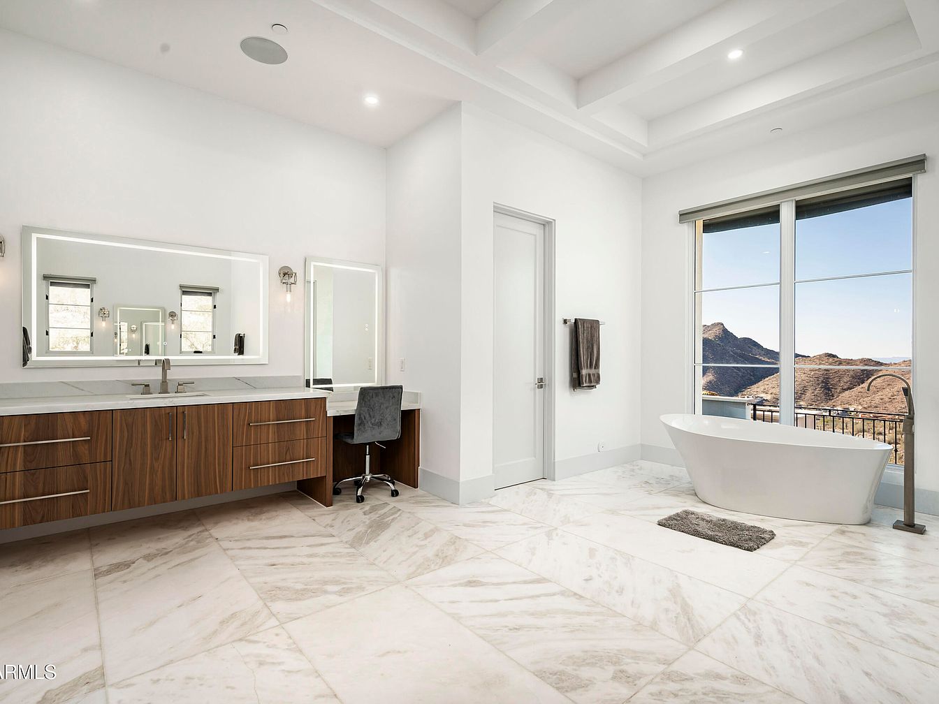 This spacious master bathroom blends elegance with modern functionality. The layout features a dual sink vanity with rich walnut cabinetry, offering ample storage and a sleek look. A freestanding soaking tub is positioned by expansive windows, providing breathtaking mountain views and flooding the space with natural light. Soft, neutral tones dominate the color scheme, complemented by refined marble flooring that adds sophistication. Practical touches include stylish wall sconces and an ergonomic chair at the vanity, making it a perfect area for morning routines. The coffered ceiling adds depth, enhancing the airy, welcoming atmosphere of this retreat.