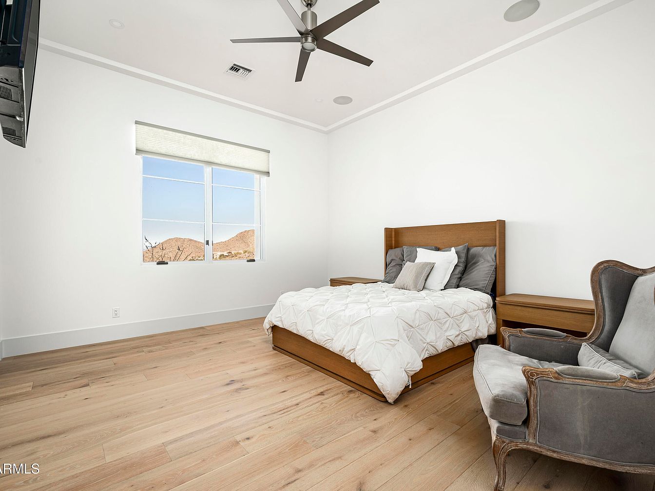 This master bedroom combines contemporary design with a cozy atmosphere. The spacious layout features a warm, neutral color scheme highlighted by light wooden flooring and crisp white walls, enhancing the natural light pouring in from the large window. The centerpiece is a sleek wooden bed, adorned with textured bedding and plush pillows, offering a comfortable yet stylish setting. Flanking the bed are minimalist nightstands that complement the modern aesthetic. A plush armchair in a vintage style adds character, inviting relaxation. The ceiling fan and recessed lighting balance functionality with elegance, creating a serene retreat for relaxation.