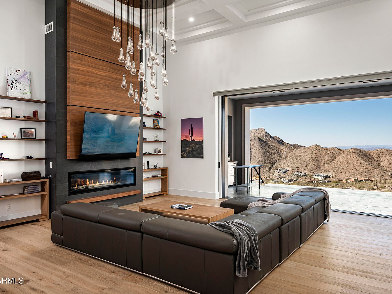 This inviting living room blends modern aesthetics with comfort, showcasing a spacious layout highlighted by a sleek, sectional leather sofa in deep brown. The warm wood accents of the feature wall, clad in rich walnut, beautifully contrast with the clean lines of the contemporary fireplace below the wall-mounted television. Bright, open spaces are enhanced by large sliding doors that reveal stunning mountain views, seamlessly connecting indoor and outdoor living. The room is adorned with pendant lighting featuring minimalist glass bulbs, and custom shelves display personal treasures, adding a touch of character. Natural light floods the space, creating a welcoming atmosphere.
