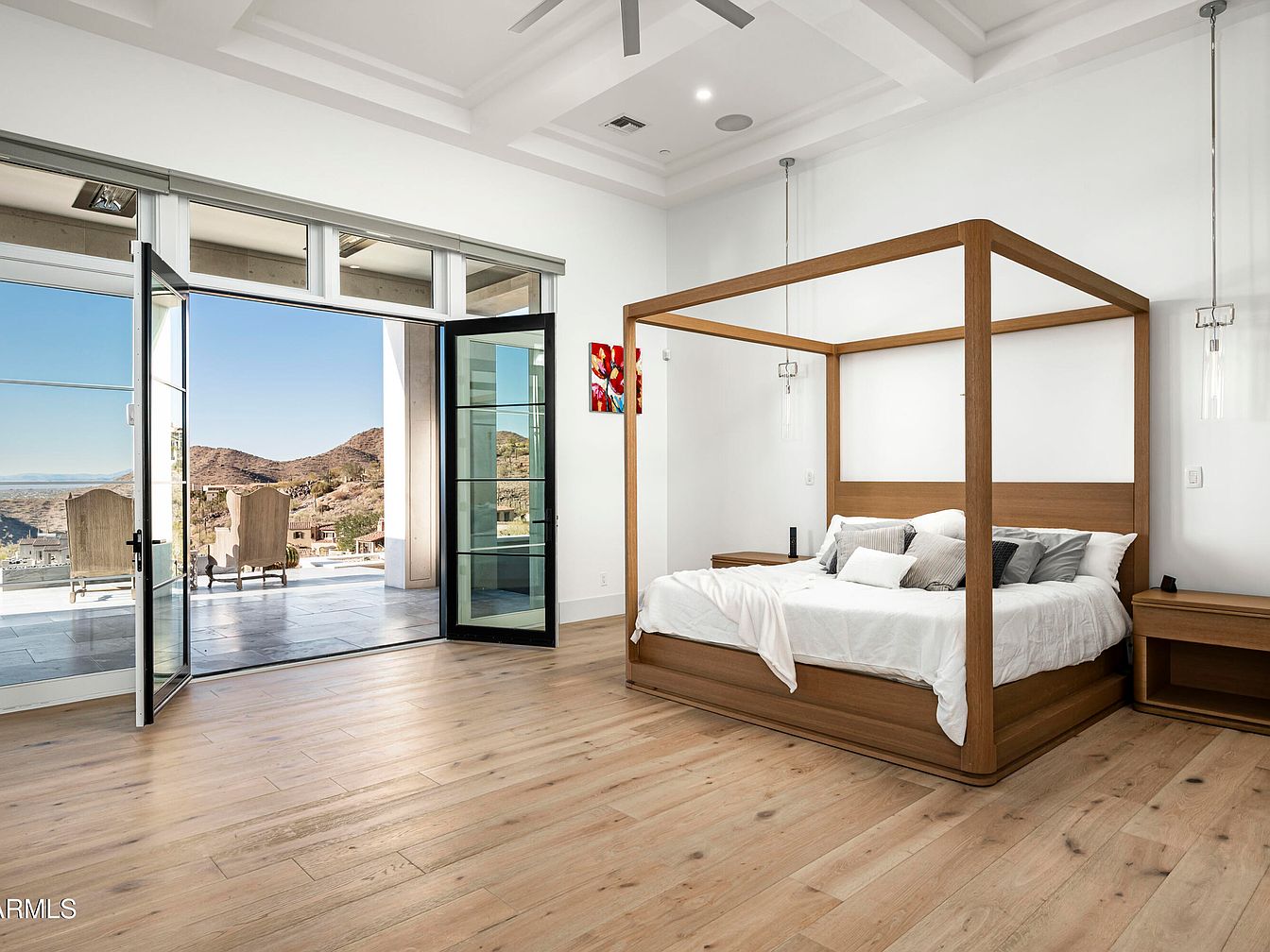 This serene master bedroom exudes modern elegance with its spacious layout and inviting design. A grand wooden four-poster bed serves as the centerpiece, complemented by plush bedding and a variety of decorative pillows that enhance comfort. Natural light floods the room through expansive glass doors that open to stunning hillside views, creating an indoor-outdoor flow. Neutral tones dominate the color scheme, featuring soft whites and warm wood accents that add warmth and tranquility. Sleek built-in shelving and minimalist nightstands provide functional storage, while the polished hardwood floors add an organic touch. The ceiling features elegant details, enhancing the overall sophistication.