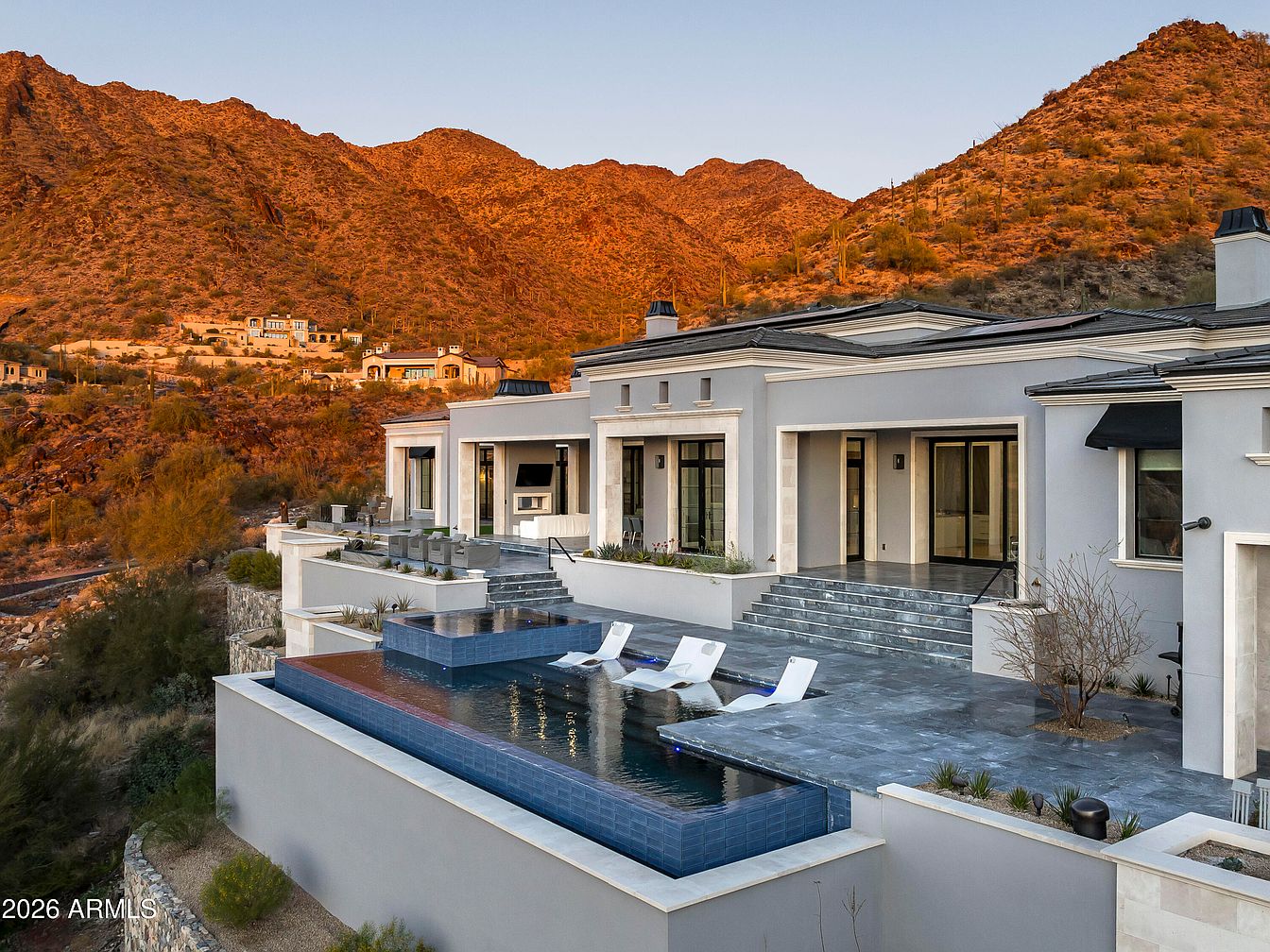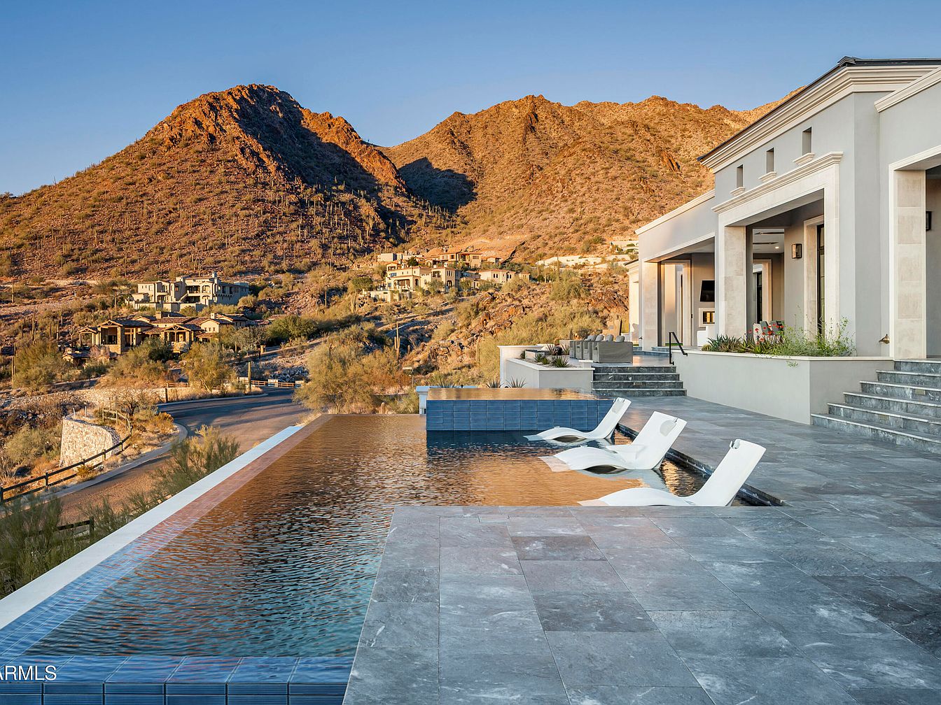 This stunning outdoor living area seamlessly blends luxury with nature. A panoramic view of the mountains surrounds an inviting infinity pool, its crystalline waters reflecting the evening sky. Sleek lounge chairs offer a serene space for relaxation, while the terrace is finished with elegant stone tiles that enhance the aesthetic. Subtle landscaping with native plants adds a touch of greenery, harmonizing with the desert environment. Architectural details, such as decorative columns and soft lighting, illuminate the space, creating a welcoming ambiance. Ideal for family gatherings or tranquil evenings, this area embodies comfort and sophistication.