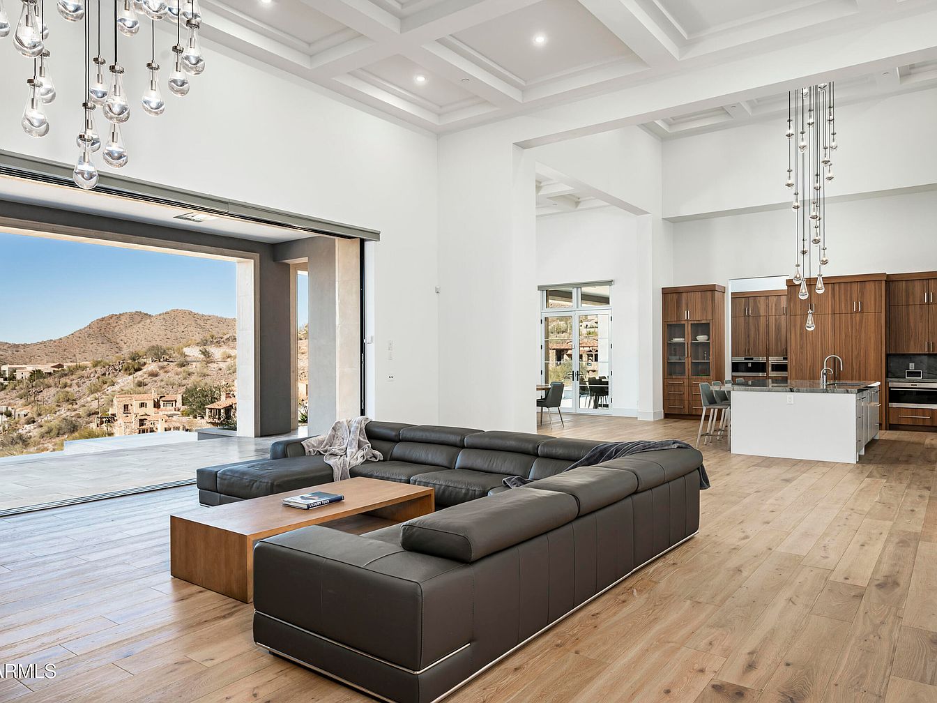This expansive open living area seamlessly blends modern elegance with family-friendly functionality. High ceilings adorned with recessed lighting and dramatic hanging fixtures create an airy atmosphere. A sleek sectional couch in deep charcoal complements the warm, natural wood flooring, while a minimalist coffee table provides ample space for gatherings. The adjacent gourmet kitchen boasts rich wood cabinetry, black countertops, and high-end appliances, ensuring an inviting culinary environment. Large sliding glass doors integrate indoor and outdoor living, providing breathtaking views of the surrounding landscape. This beautifully designed space is perfect for relaxation and socializing, embodying contemporary lifestyle.