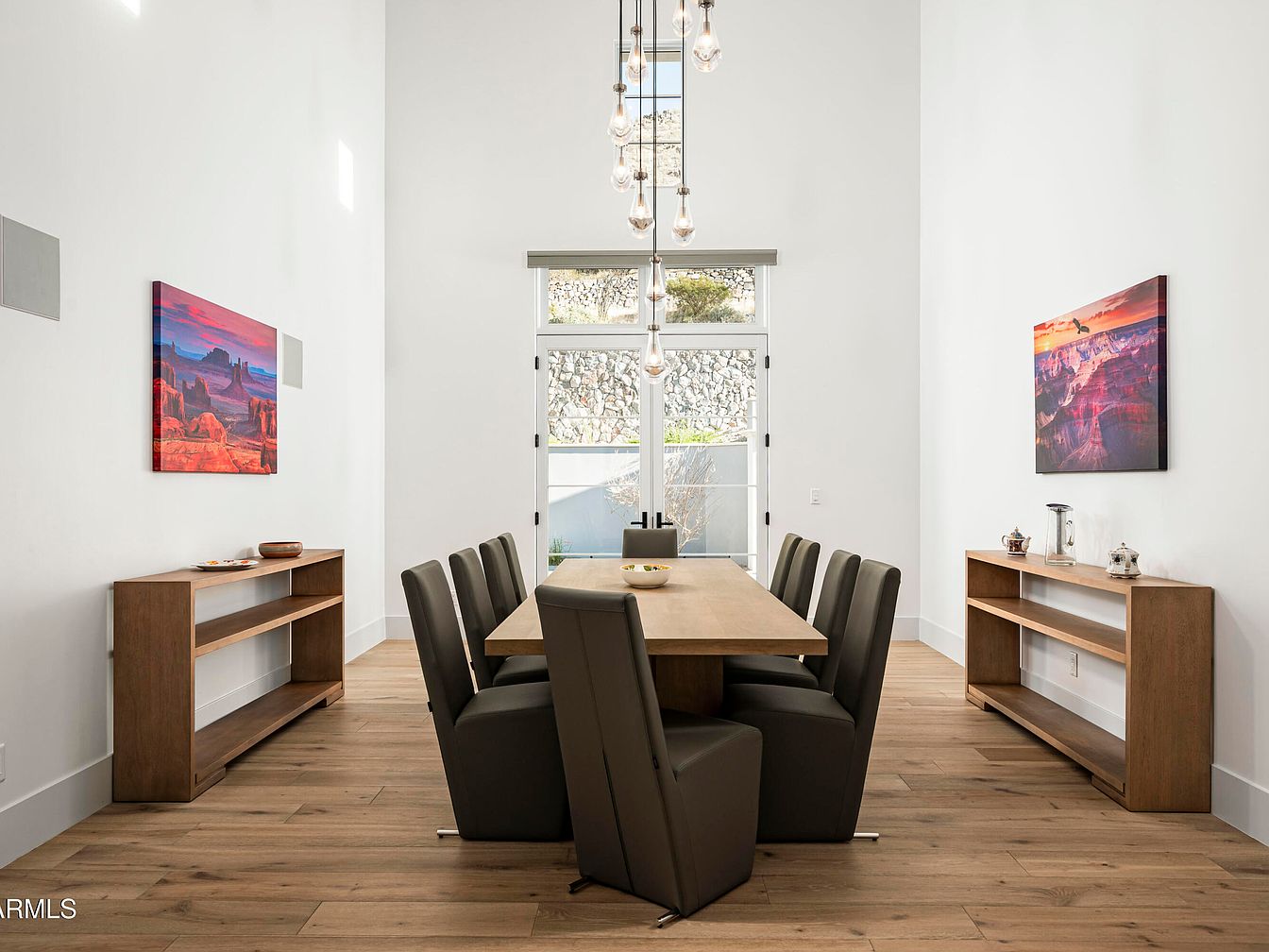 This contemporary dining room features a spacious, elongated table at its center, surrounded by sleek, upholstered chairs that offer both comfort and modern aesthetics. Tall ceilings enhance the openness of the space, while strategically placed pendant lights add a touch of sophistication. The walls are adorned with vibrant artwork, providing a striking contrast against the crisp, white backdrop. Natural wood flooring adds warmth, complementing the earthy tones of the furniture. Family-friendly features are evident in the generous layout, offering ample room for gatherings. Large windows invite an abundance of natural light, creating an inviting atmosphere.