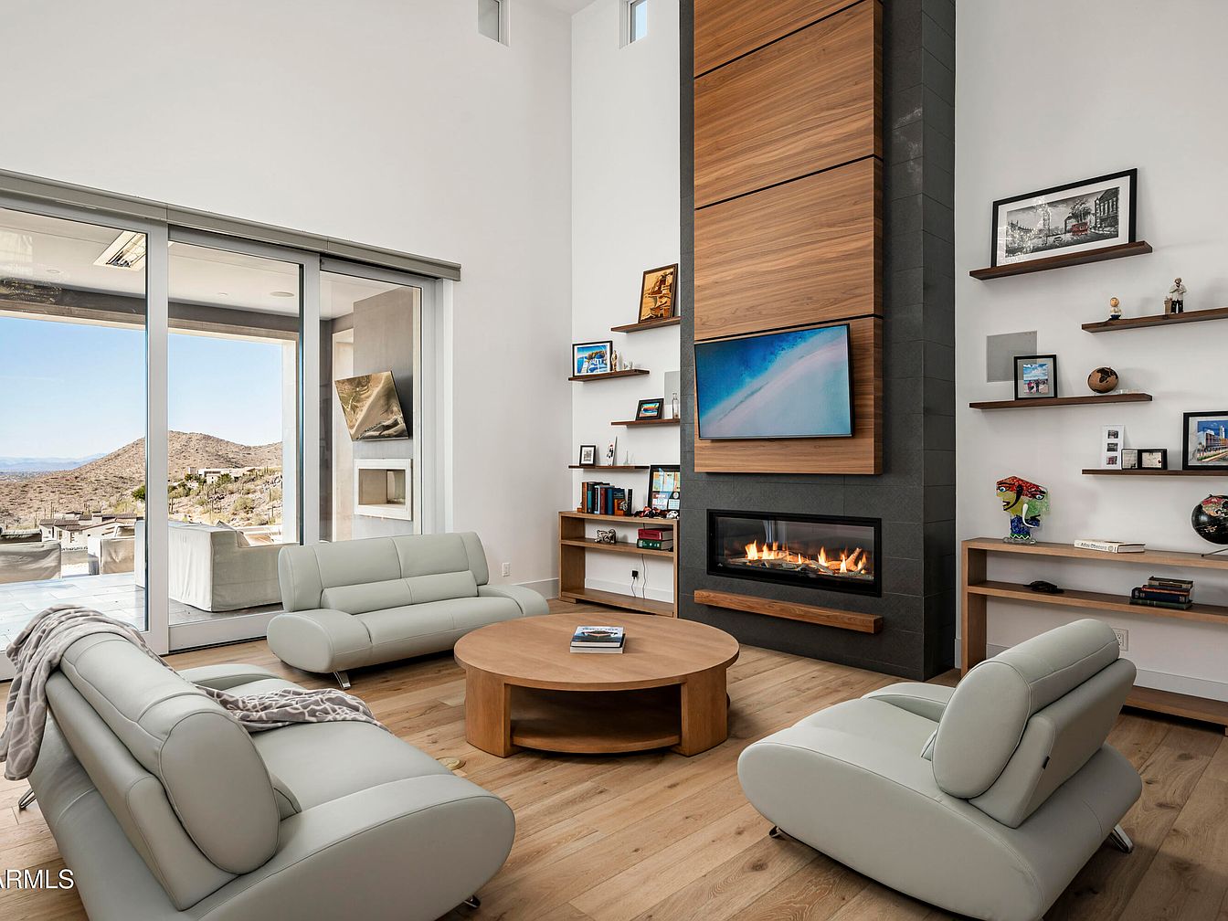 This inviting modern living room features an open layout with expansive glass walls that invite natural light and stunning views of the surrounding landscape. A sleek, linear fireplace is the focal point, framed by a stylish combination of wood and stone, enhancing the contemporary aesthetic. Soft, light gray leather seating offers comfort and elegance, complemented by a round wooden coffee table that fosters a cozy gathering space. Floating shelves adorned with personal mementos and artwork contribute to the room’s character, while warm wooden flooring adds a touch of warmth, making it perfect for family gatherings and relaxation.