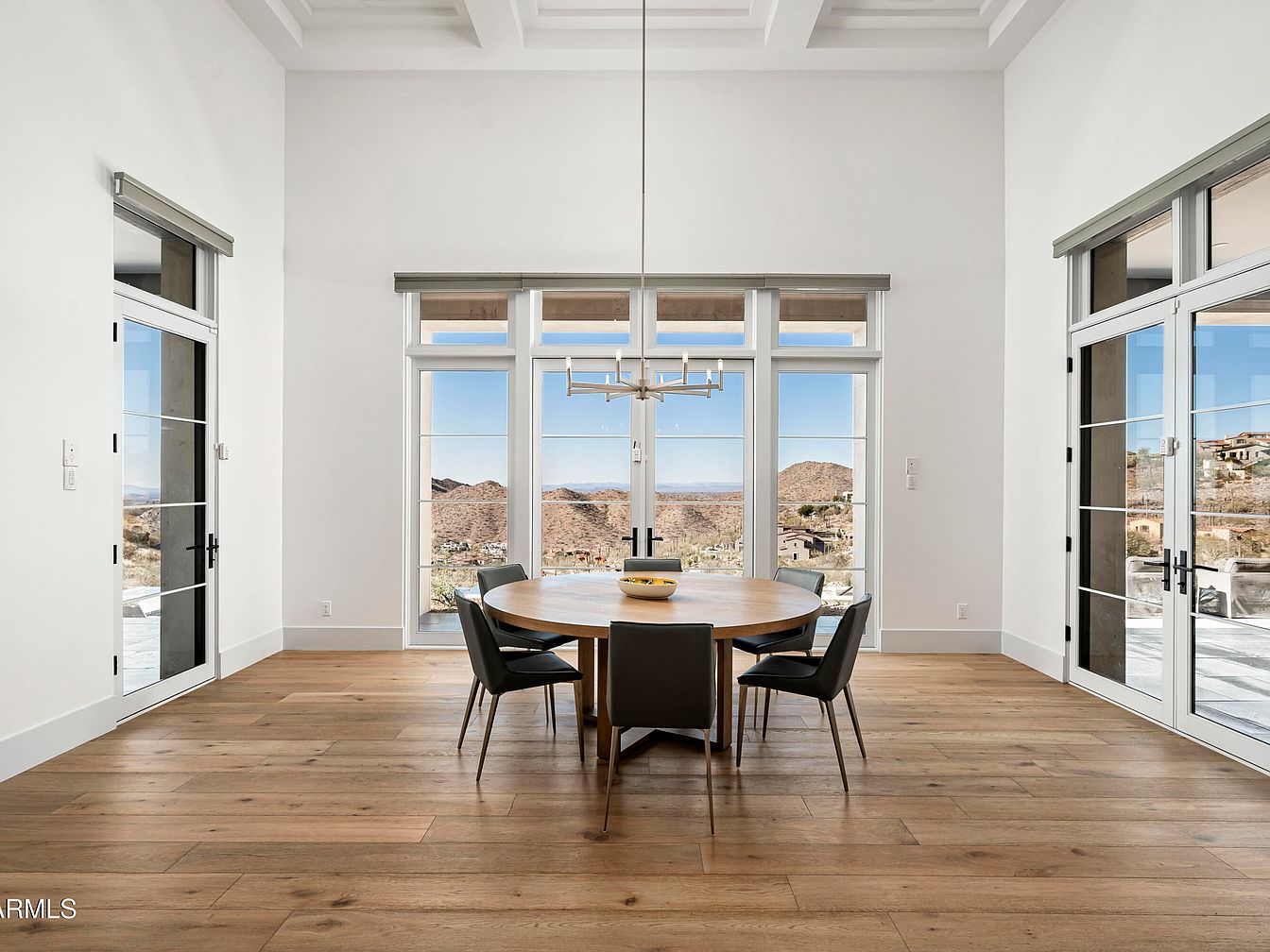 This dining area features a spacious circular table surrounded by elegant black chairs, creating a contemporary yet inviting atmosphere. Large glass doors on either side flood the space with natural light and showcase breathtaking mountain views, blurring the line between indoor and outdoor living. The high coffered ceiling adds architectural interest, while the warm wooden flooring invites warmth and comfort. A modern chandelier hangs centrally, providing a focal point that complements the minimalist design. This family-friendly area encourages gatherings and meals with loved ones, making it a perfect spot for creating lasting memories.