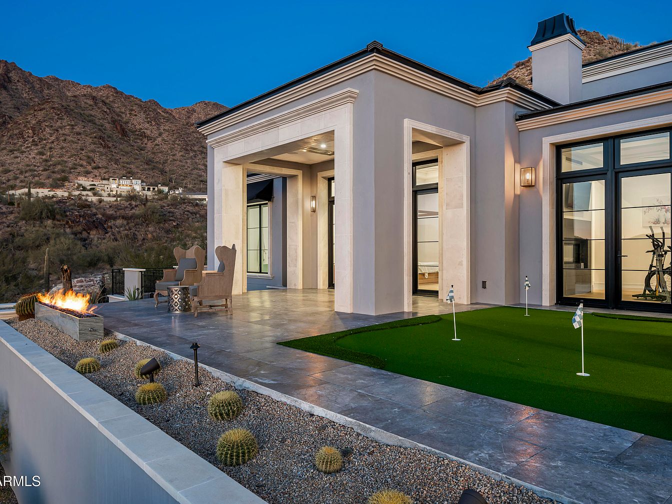This stunning patio seamlessly blends indoor and outdoor living, showcasing a sleek stone flooring design that extends into a lush, artificial lawn area, perfect for family activities. The minimalist architecture features large black-framed windows that invite natural light, creating a warm and welcoming atmosphere. Cozy armchairs flank a modern outdoor fire pit, offering a cozy gathering spot during cooler evenings. Stylish desert landscaping, with strategically placed cacti and gravel beds, complements the home’s contemporary aesthetic while enhancing privacy. This space is ideal for entertaining guests or enjoying peaceful moments, bridging the elegance of modern design with outdoor serenity.
