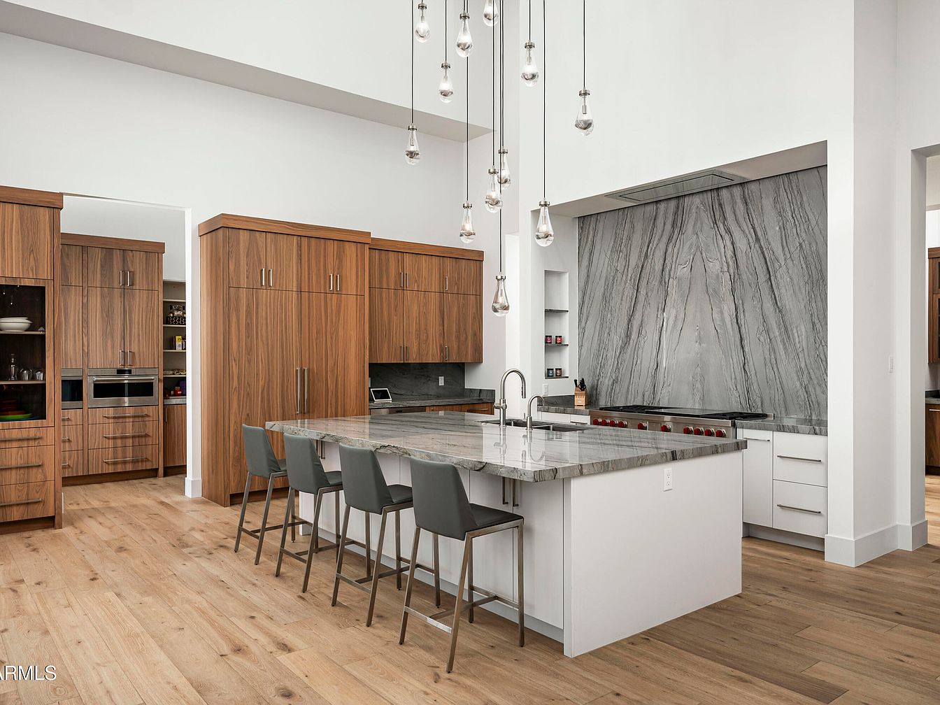 This modern kitchen showcases a sleek design with an impressive central island topped with a striking gray marble surface, perfect for cooking and entertaining. The rich wooden cabinetry offers ample storage while adding warmth to the space. Pendant lights hang gracefully from the high ceiling, enhancing the airy atmosphere. A stylish backsplash with bold marble veining complements the minimalist aesthetic. The open layout is both functional and inviting, ideal for family gatherings. Soft neutral hues combined with natural wood accents create a balanced environment, ensuring this kitchen is not just beautiful, but also a welcoming hub for daily activities.