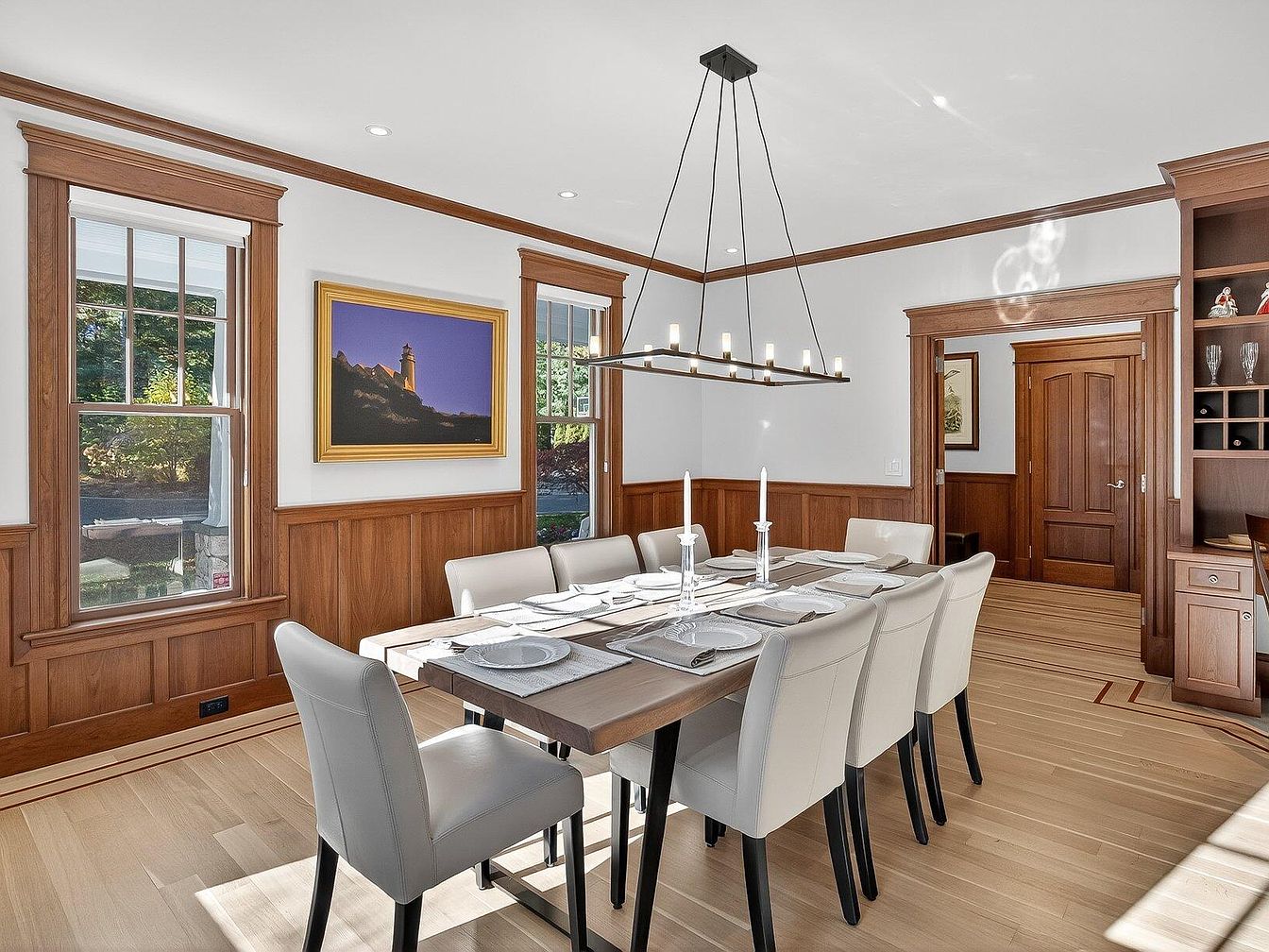 This dining room embodies warmth and sophistication, featuring rich wood paneling that contrasts beautifully with the light hardwood flooring. A spacious wooden table centers the room, perfectly set for family gatherings, surrounded by contemporary upholstered chairs that invite long conversations. Ample natural light floods in through large windows, enhanced by the soft glow of an elegant chandelier above. The walls are adorned with tasteful artwork, adding a personal touch. Architectural details, such as crown molding and fitted cabinetry, elevate the overall aesthetic, making it a perfect blend of inviting charm and modern design for memorable dining experiences.