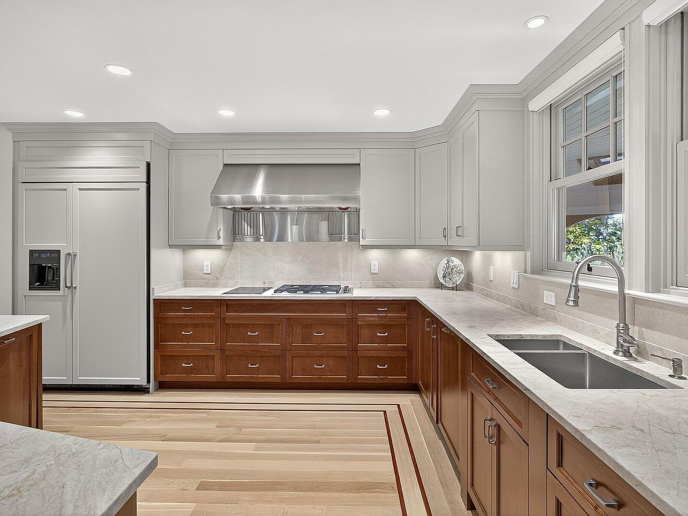 This contemporary kitchen showcases a well-planned layout with a harmonious blend of functionality and style. The light grey cabinetry complements rich wooden drawers, offering ample storage while maintaining a clean aesthetic. A large island provides a perfect workspace, topped with luxurious marble that enhances the inviting atmosphere. Stainless steel appliances, including a sleek range hood and refrigerator, lend a modern touch, while under-cabinet lighting illuminates the space beautifully. Large windows flood the kitchen with natural light, creating a warm and welcoming environment ideal for family gatherings, cooking, or casual dining. This design perfectly balances elegance and practicality.