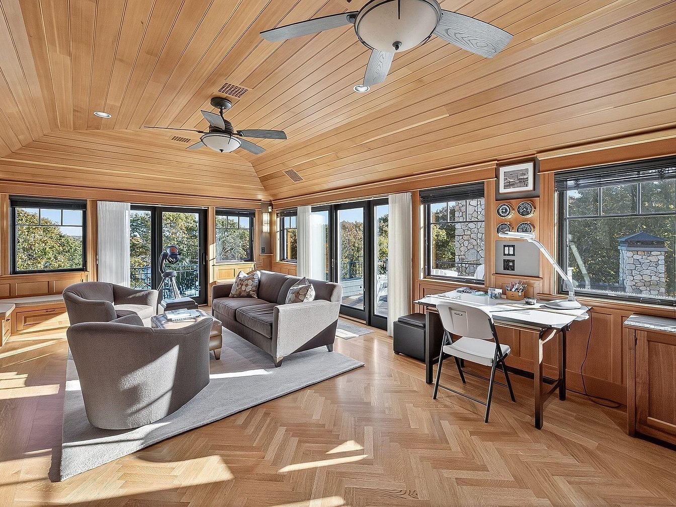 This inviting family room features a warm, wood-paneled ceiling and a spacious layout, ideal for relaxation and gatherings. A plush gray sofa paired with two accent chairs creates a comfortable seating area, centered around a soft area rug that complements the herringbone pattern of the hardwood floor. Large windows frame the surrounding greenery, allowing natural light to flood in and create an airy atmosphere. A sleek desk workspace against the wall provides practicality without sacrificing style. Tasteful decor, including framed photos and playful throw pillows, adds personal touches, making this space perfect for both family activities and quiet evenings.