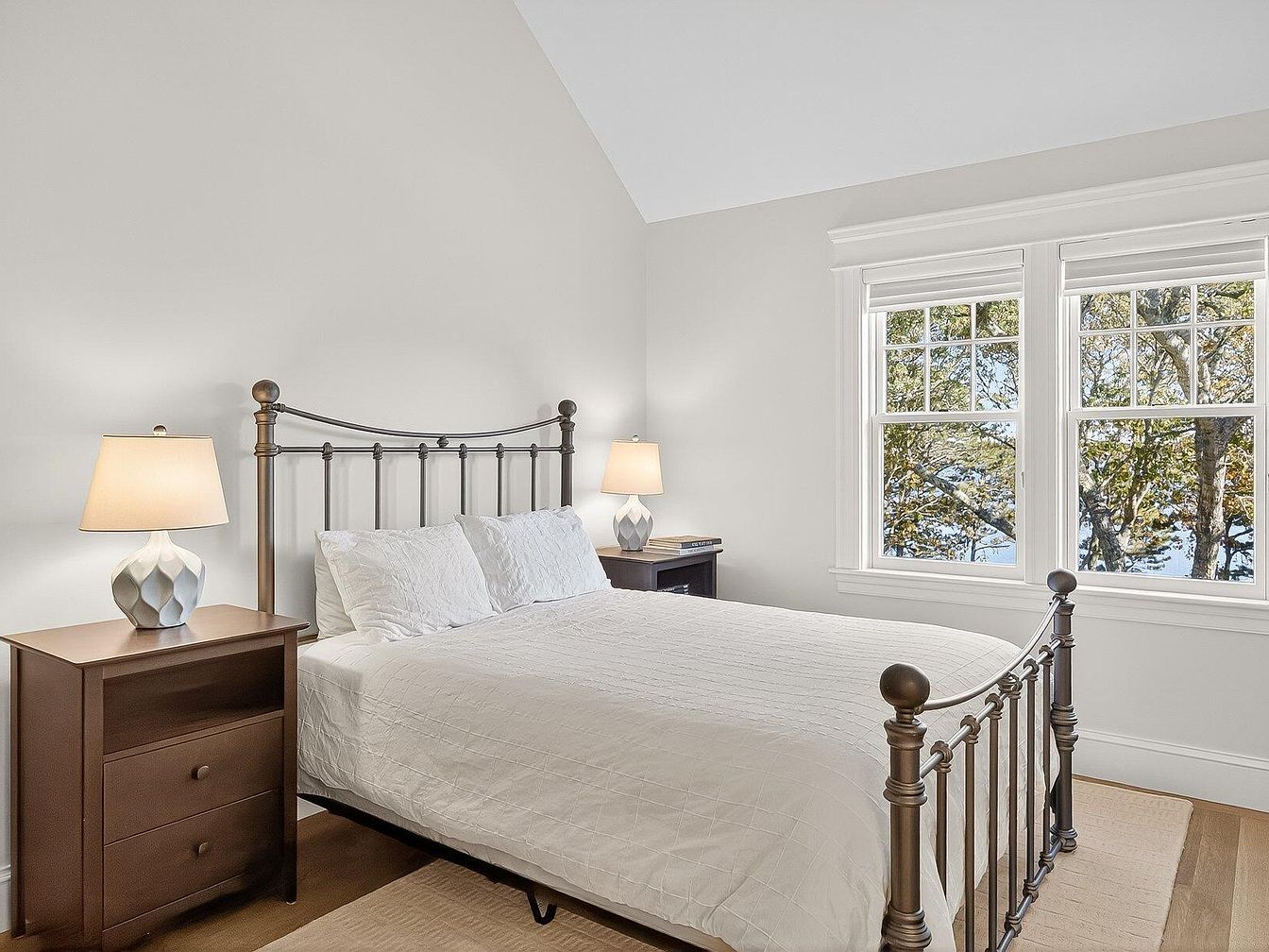 This inviting master bedroom features a pleasing combination of simplicity and elegance. The room showcases a plush white bed adorned with textured bedding, complemented by a stylish metal headboard that adds a touch of modern charm. Two bedside tables with gently curved lamps offer both functionality and warm illumination. The walls are painted in a soft, neutral tone, enhancing the sense of tranquility. Large windows fill the space with natural light and frame a picturesque view of lush trees outside, creating a peaceful atmosphere. The natural wood flooring adds warmth, making it a welcoming retreat for relaxation.